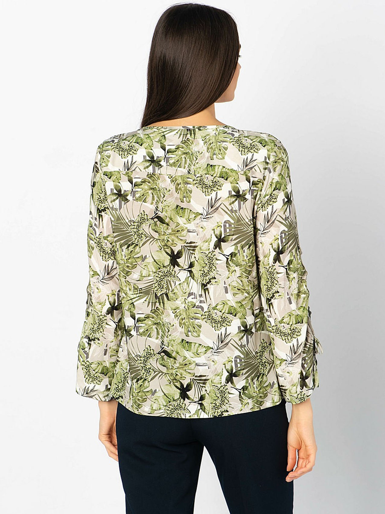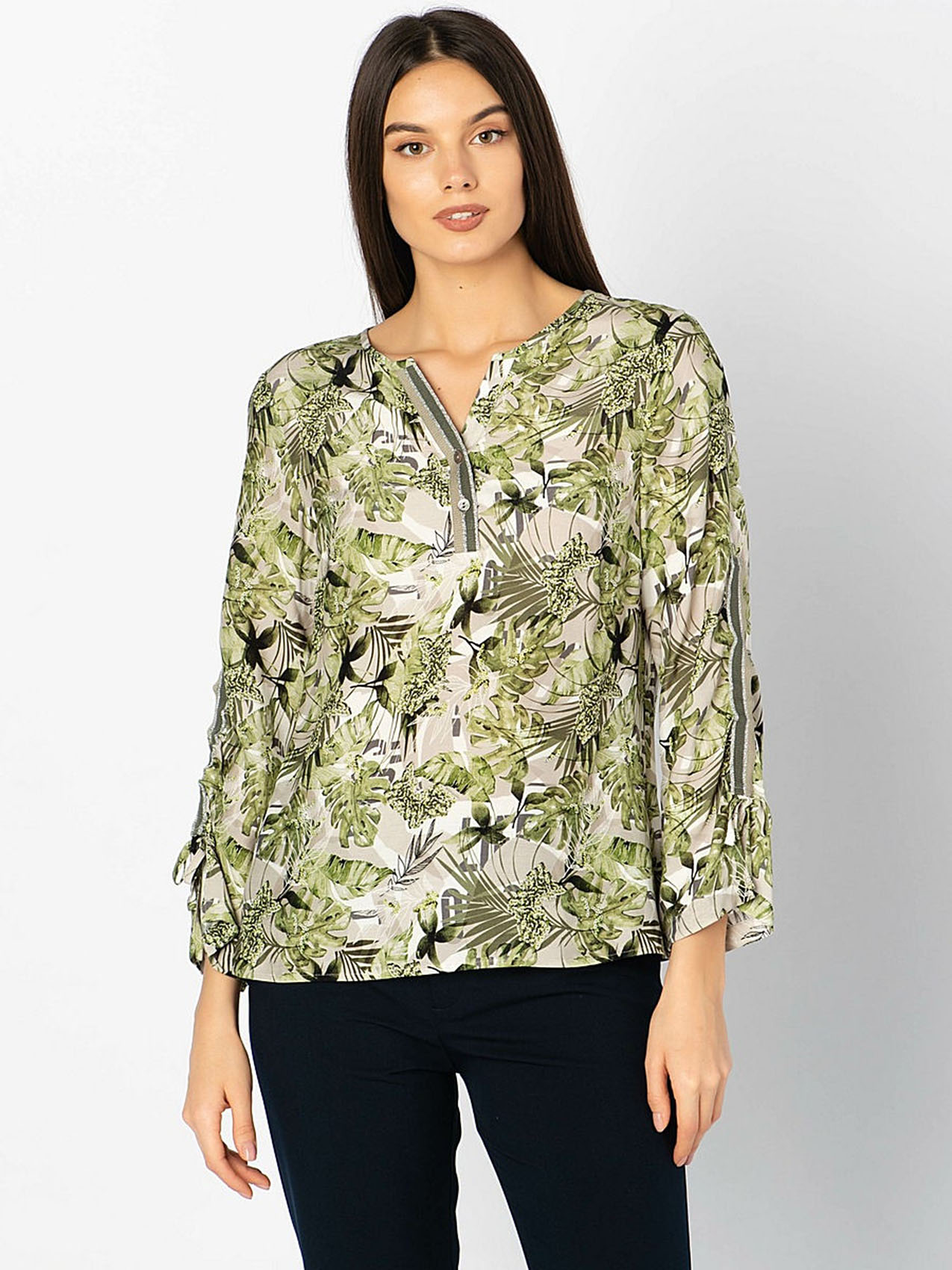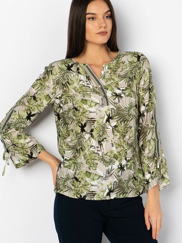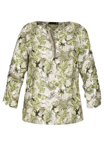 • свободный покрой • трендовый принт с тропическими мотивами • приятный к телу вискозный материал • застежка на пуговицах • длина изделия по спинке: 65 см.