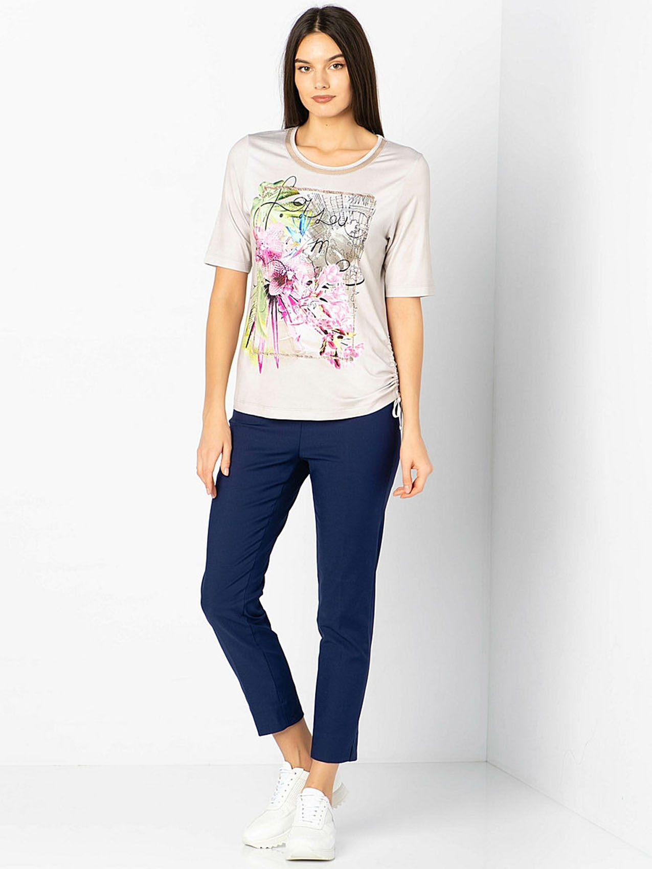 Мечтаете о тропиках? Тогда эта футболка - именно то, что нужно! Приятная расцветка и трендовый принт с изображением экзотических цветов перенесет вас в теплые края. Мягкий материал из смеси вискозы и эластана гарантирует отличную посадку, а рукав 1/2 придает образу легкость и непринужденность. Футболка будет замечательным компаньоном как в брючном, так и в юбочном комплекте.