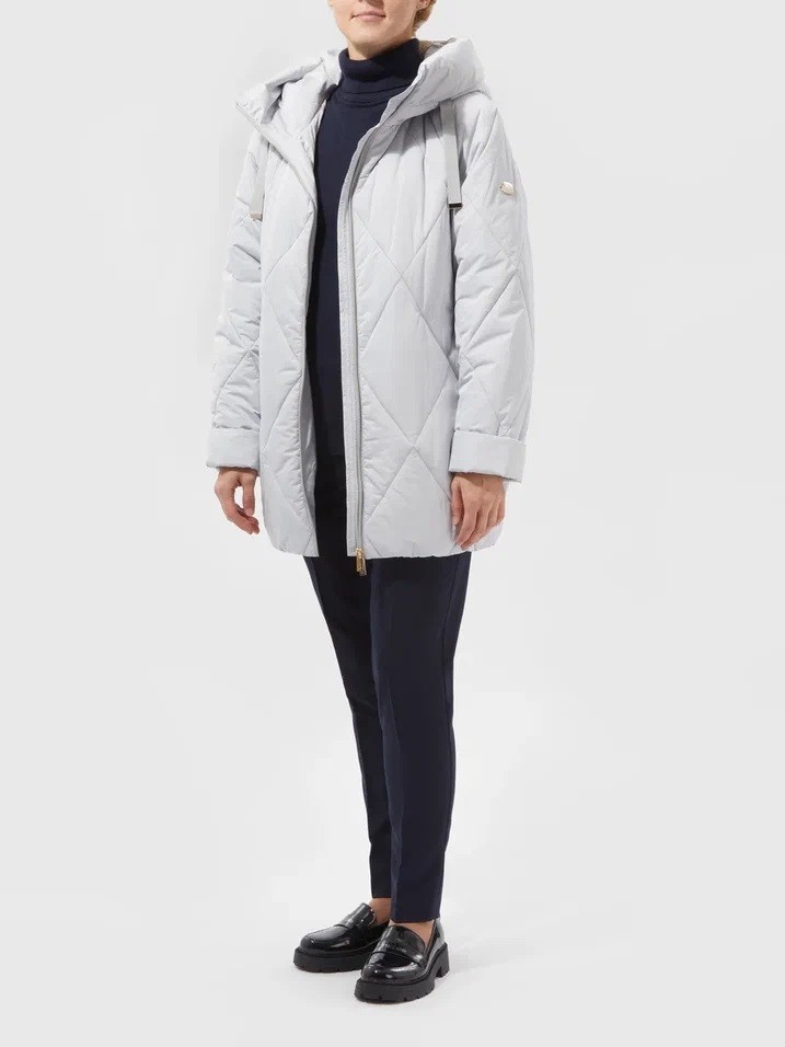 Светло-серая стеганая куртка. Регулируемые шнурки с металлическими наконечниками добавляют элемент стиля. Диагональные стеганые швы образуют изящный ромбовидный узор по всей поверхности изделия. Практичный дизайн и качественный материал делают куртку универсальной и комфортной для повседневной носки.