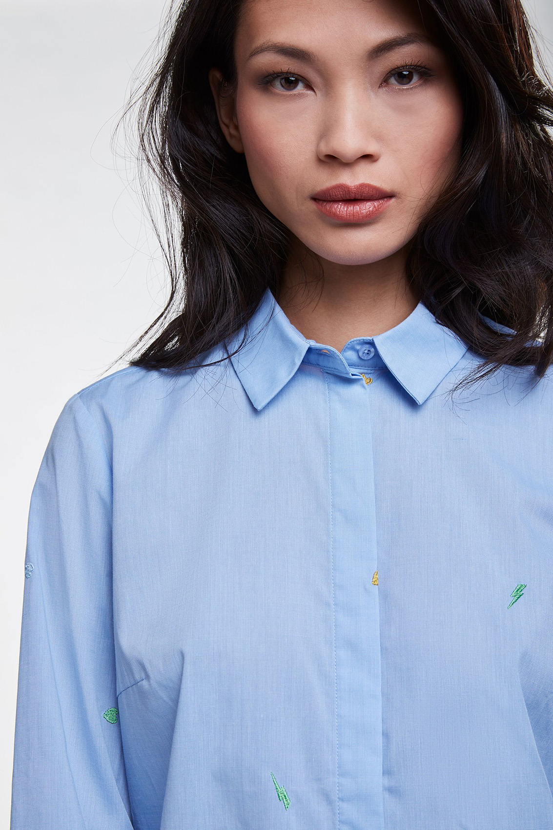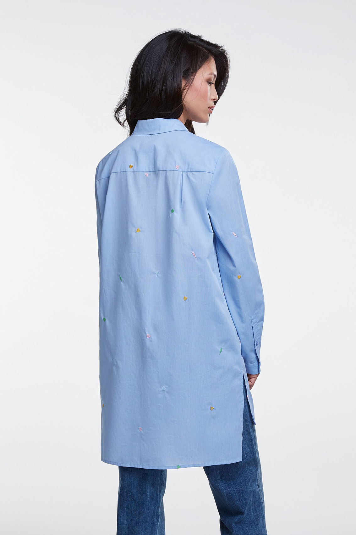 Удлиненная блуза - изюминка коллекции! Прямой покрой, отложной воротничок, застежка на пуговицах, длинные рукава. Удлиненная спинка изделия, разрезы по бокам. Ткань с вышитыми элементами. Эта блуза в стиле кэжуал предполагает огромное множество модных интерпретаций.