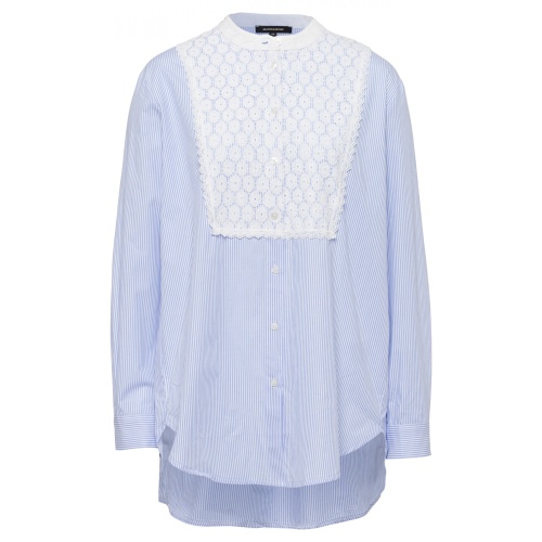 Бело-голубая блуза в полоску с небольшим воротником-стойкой и кружевной отделкой. Длинные рукава с манжетами на пуговицах. Низ модели скругленный, удлиненный сзади. Длина в размере 44 = 78см