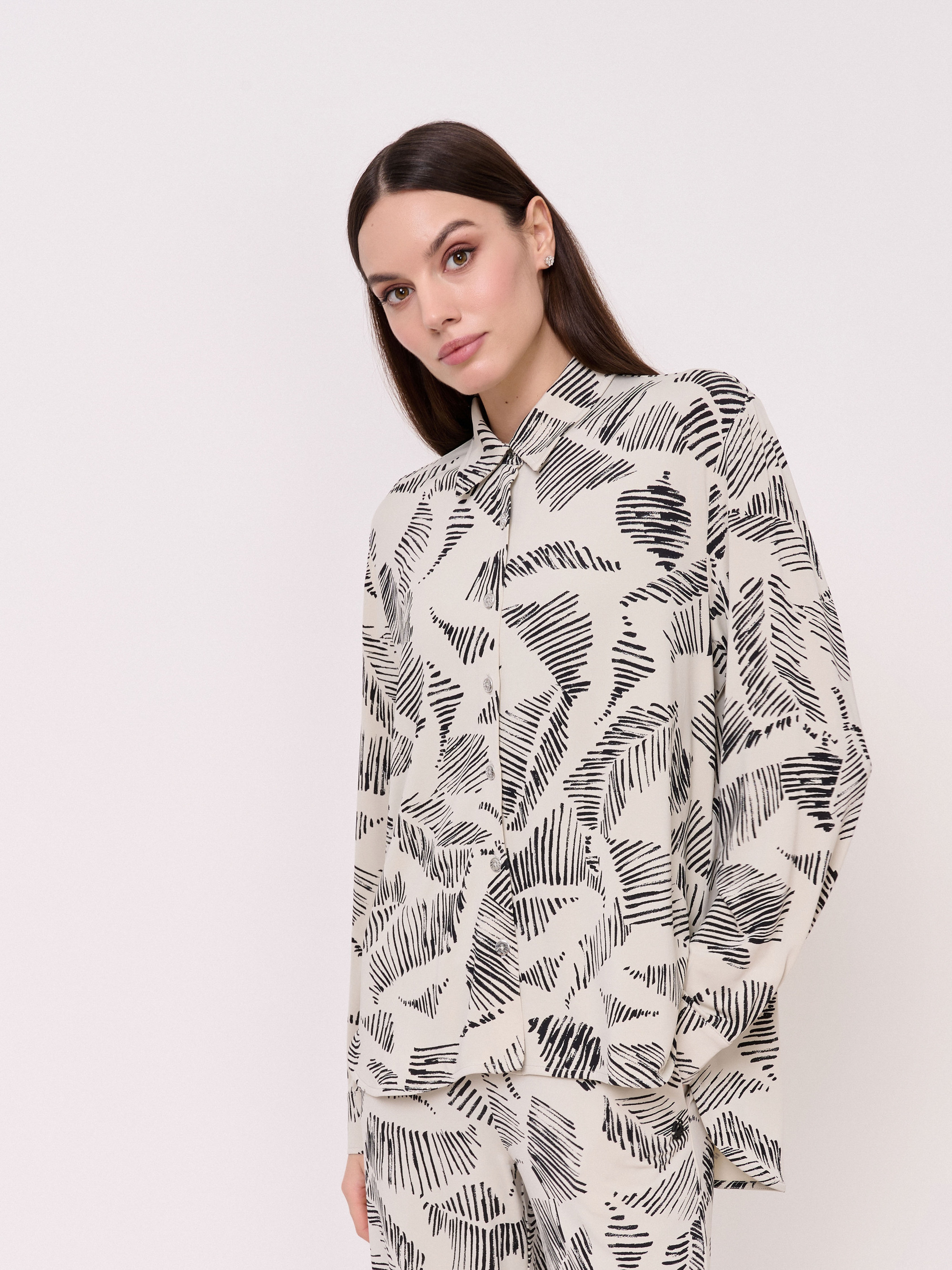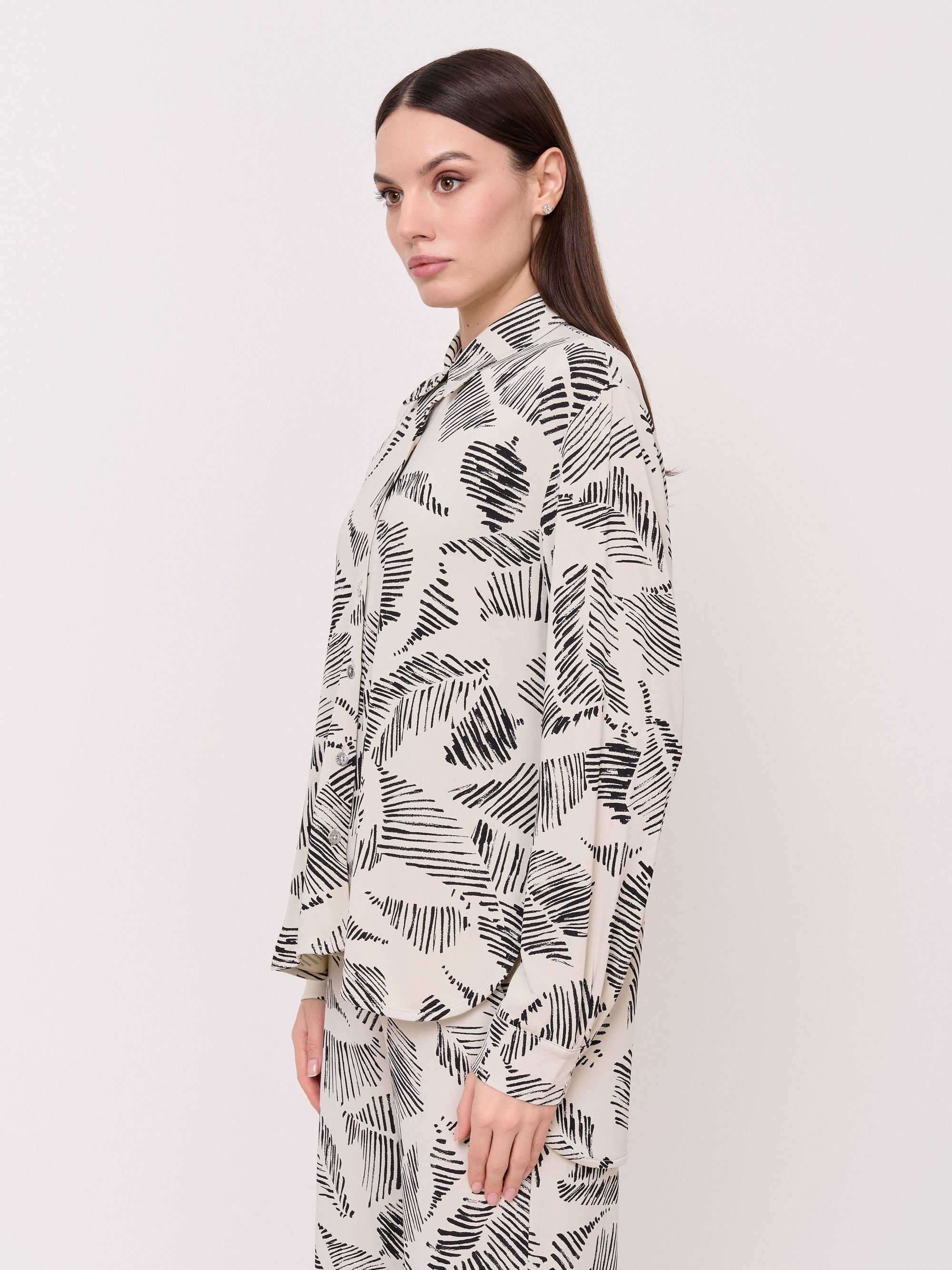Детали: застежка пуговицы, вырез горловины отложной воротничок, рукава длинные, покрой рубашечный, рисунок абстракция. Длина по спинке: 74 см.