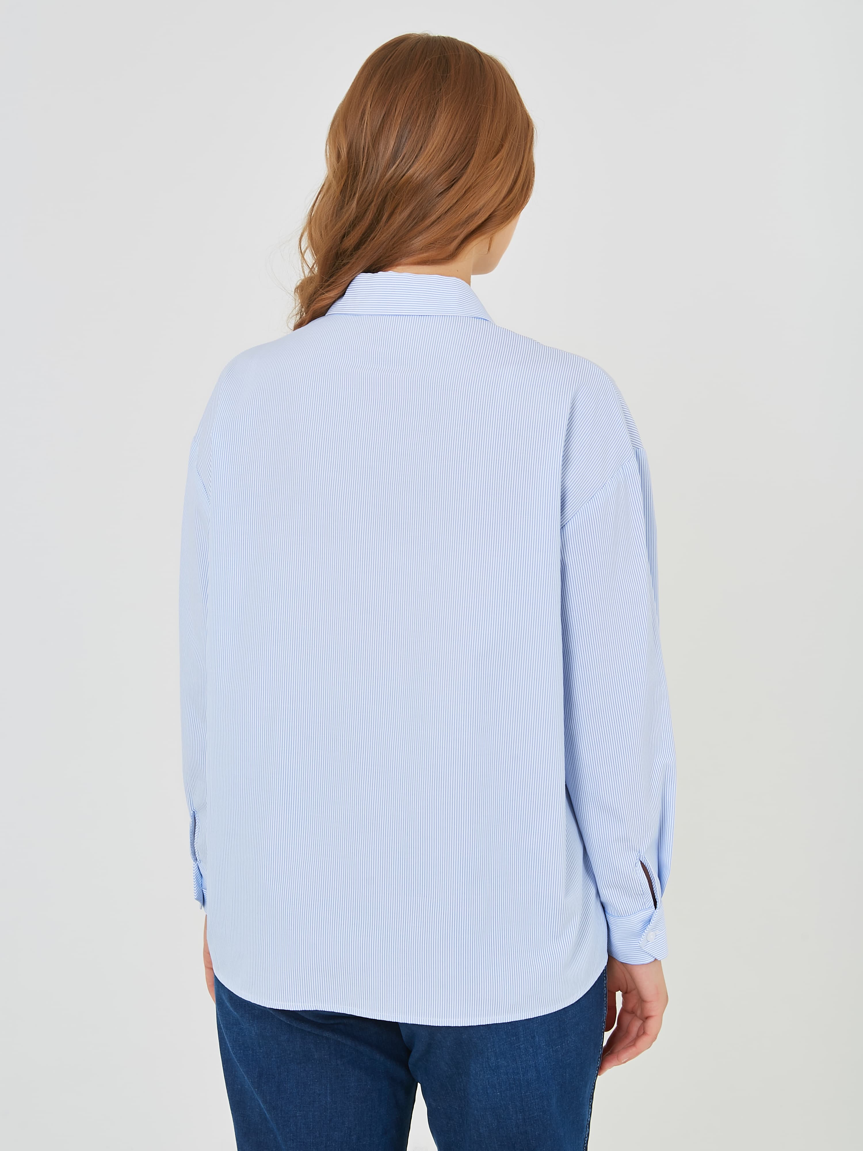 Классическая рабашка на пуговицах в вертикальную полоску. Украшена цветами из пайеток разных цветов. Коллекция Весна-Лето 2025. Капсула "Самарканд". Параметры модели: 95-64-101, рост 175, размер 44-46