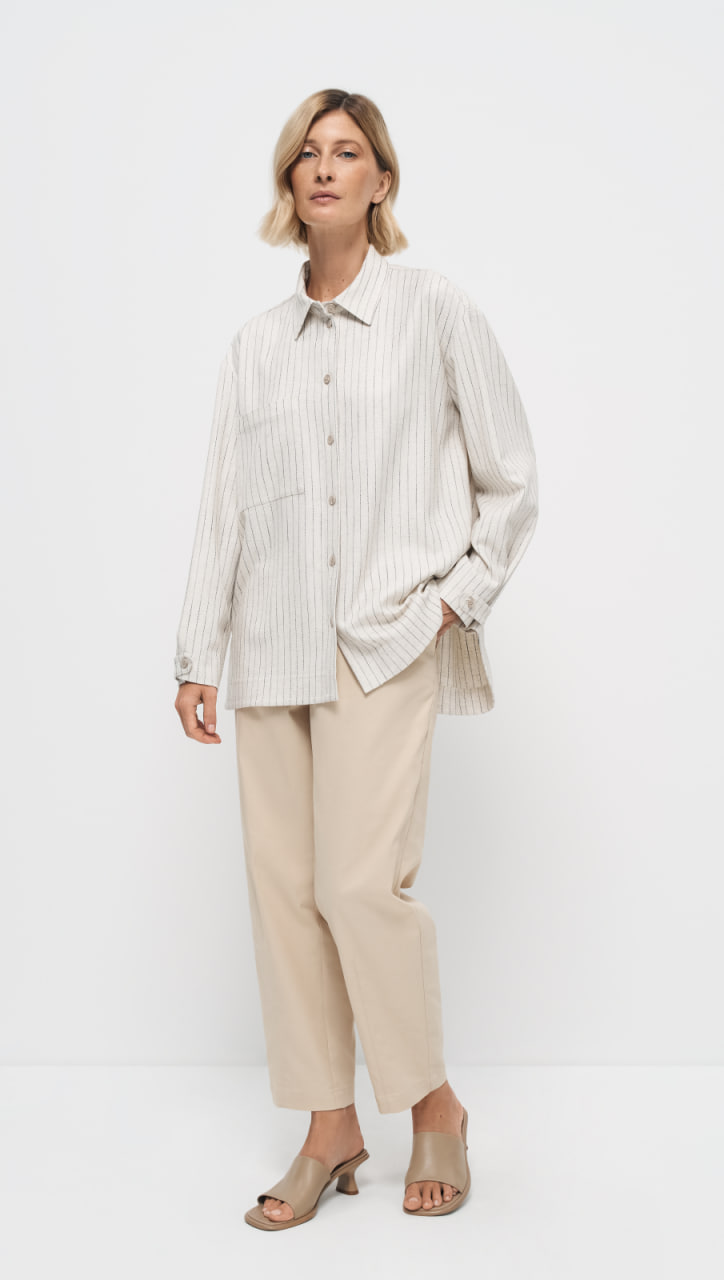 Блуза выполнена из ткани в полоску с содержанием льна, что придает изделию натуральность и текстурность. Цвет "льняной пергамент" добавляет модели нейтральности и универсальности.