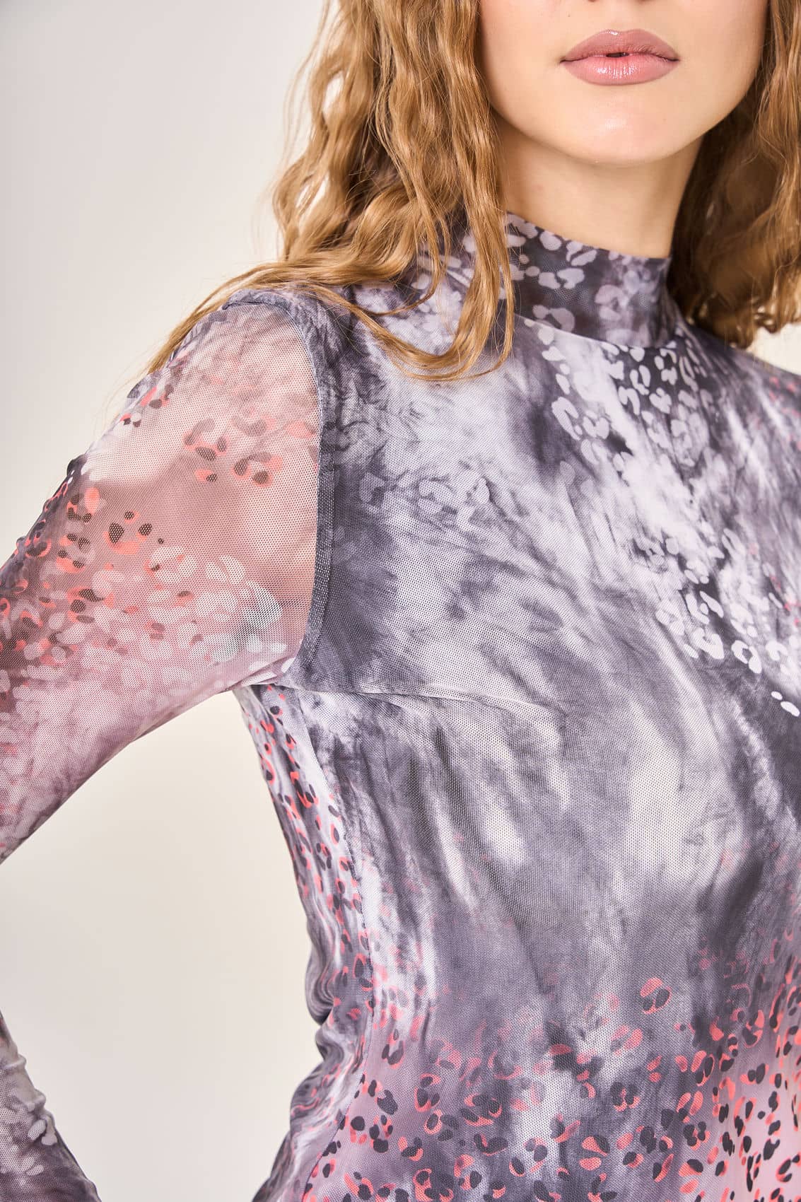Женская облегающая блузка с длинными рукавами и воротником-стойкой. Сложная цветовая гамма с размытыми пятнами серого, белого и розового оттенков создает глубину и выразительность. Мелкий принт в виде леопардовых пятен, выполненный в различных оттенках розового и серого, добавляет изделию уникальности и стиля. Натуральная ткань приятно прилегает к коже, подчеркивая красоту фигуры.Осень-Зима'25/26. Капсула "Вишневый сад"