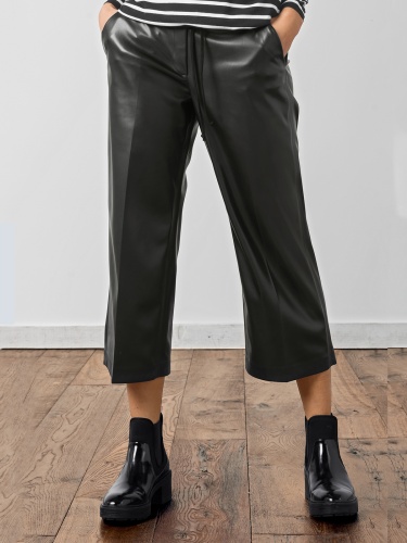 Кюлоты из экокожи свободного кроя. Комфортная высокая посадка, эластичный притачной пояс. Боковые карманы. Кюлоты – актуальная модель брюк, с которой можно составить различные образы в повседневном и официальном стиле.