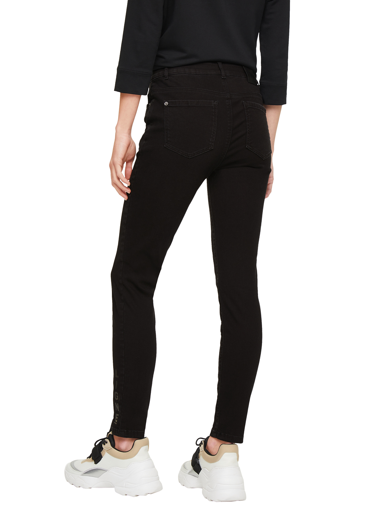Зауженные джинсы с потертостями и принтом. Высокая посадка, пояс со шлевками. Внутренние передние и задние накладные карманы. Застежка на скрытую молнию и пуговицу.