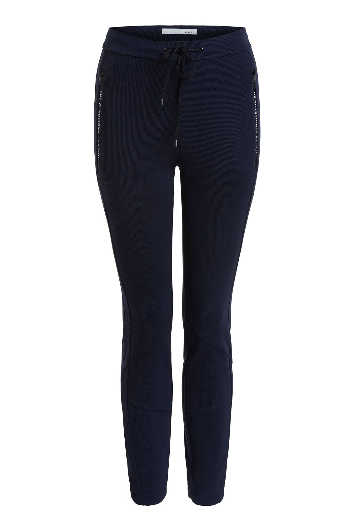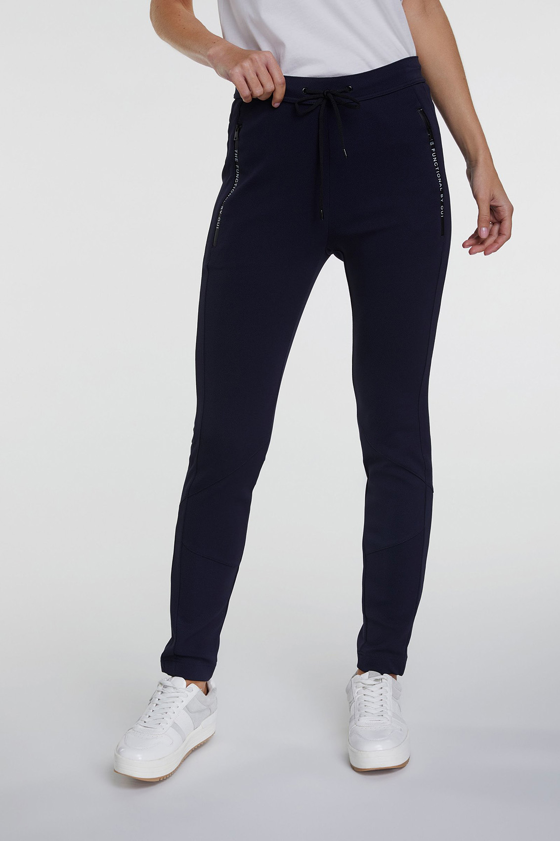 Спортивные брюки помогут угнаться за модой! Удобная средняя посадка, пояс с кулиской. Силуэт slim подчеркивает стройные ноги. Карманы на молниях декорированы тесьмой. Эти брюки - отличный выбор для прогулок и занятий спортом.