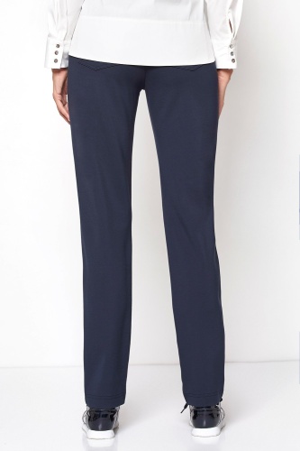 Синие брюки прямого кроя – элегантный и комфортный вариант низа, идеально подходит для делового стиля. Эластичный пояс обеспечивает удобство носки и комфортную посадку. Состав из вискозной смеси гарантирует долговечность изделия. Передние прорезные и накладные задние карманы. Милый акцент в виде металлического лейбла-сердечка.