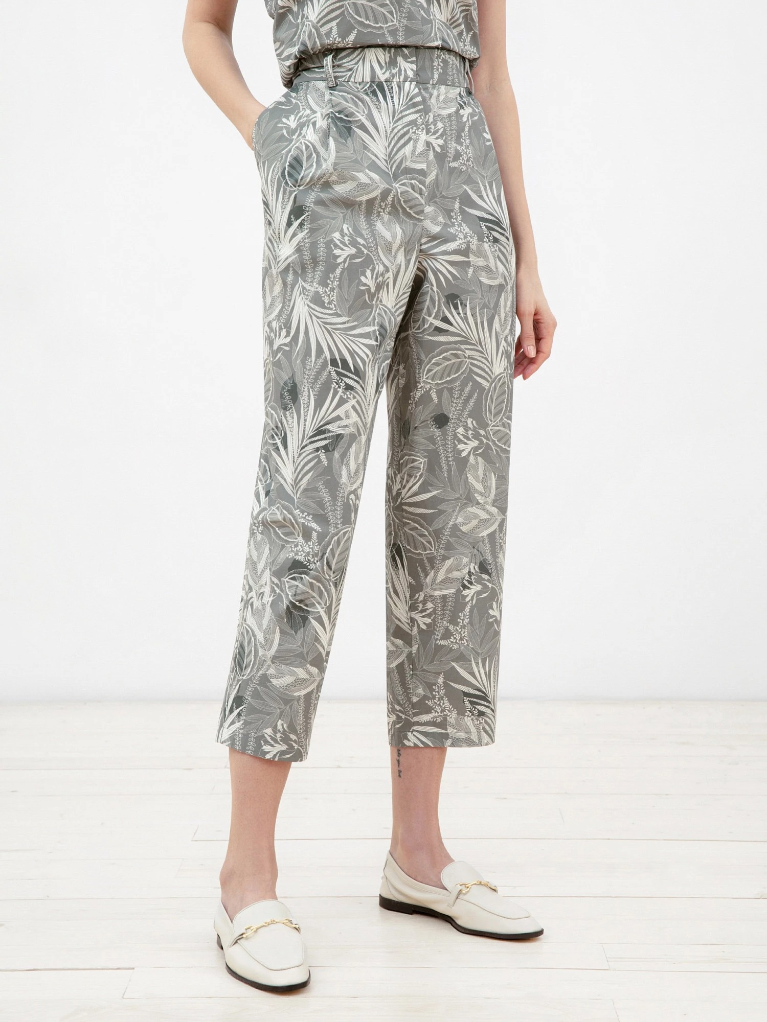 Брюки из хлопковой ткани силуэта "бананы", длиной 7/8, на притачном поясе из основной ткани. С защипами по линии пояса для наилучшей посадки. Имеют два комфортных боковых кармана.