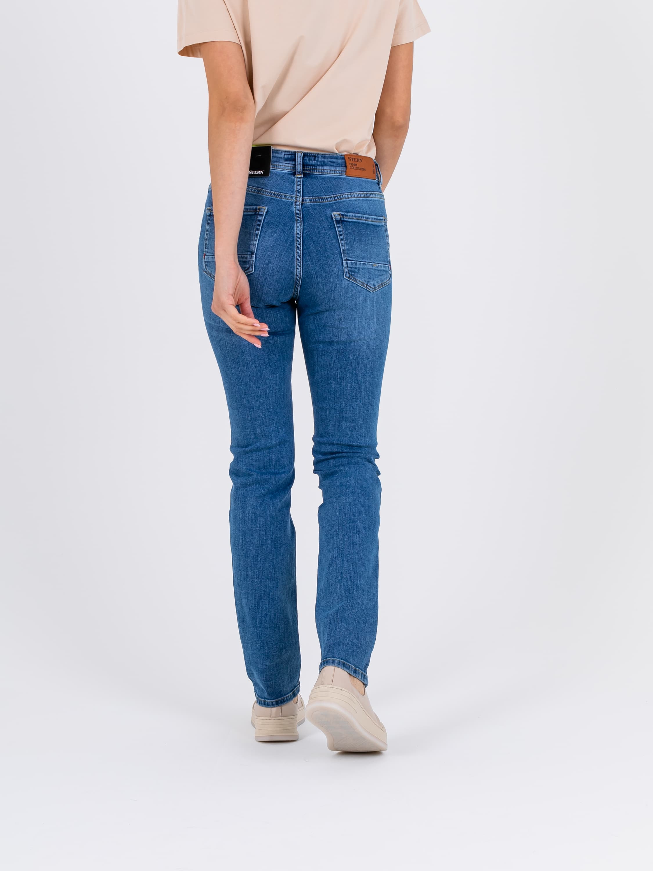 Длинные джинсы «Slim Fit» с застежкой на молнию и 1 пуговицу. Джинсы слегка зауженные книзу, с легким варёным эффектом. На передних половинках расположены два кармана с отрезным бочком и один монетный карман. На задних половинках два накладных кармана с декоративными горизонтальными швами и фигурная кокетка. Верх брюк обработан поясом со шлевками.
