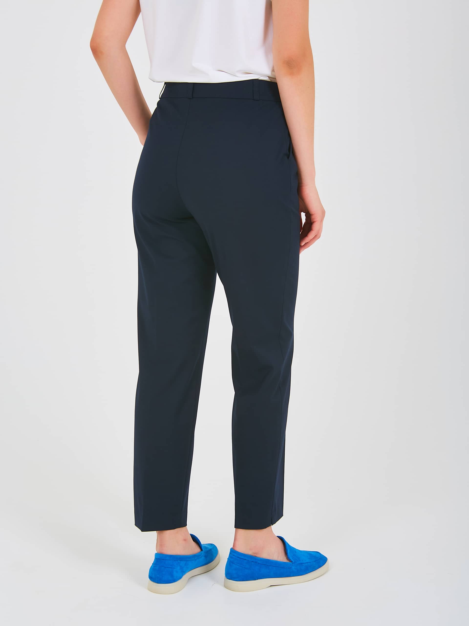 Прямые брюки с завышенной талией, длиной до щиколоток с застежкой на молнию и 1 пуговицу. Брюки слегка зауженные книзу. На передних половинках расположены два кармана с отрезным бочком. Верх брюк обработан поясом со шлевками.