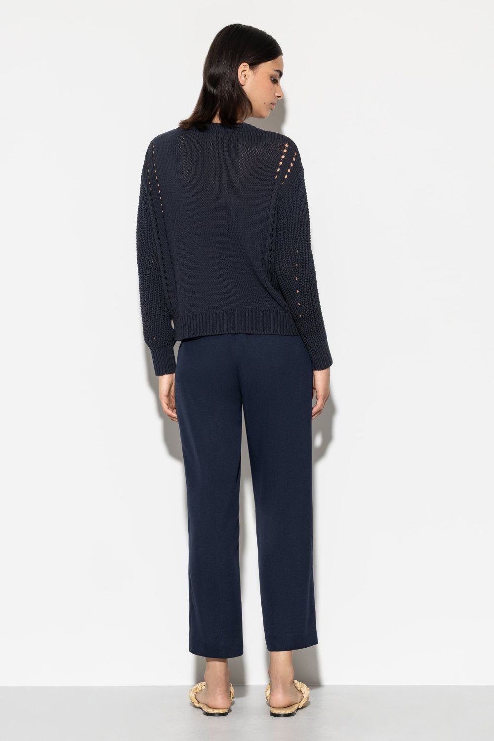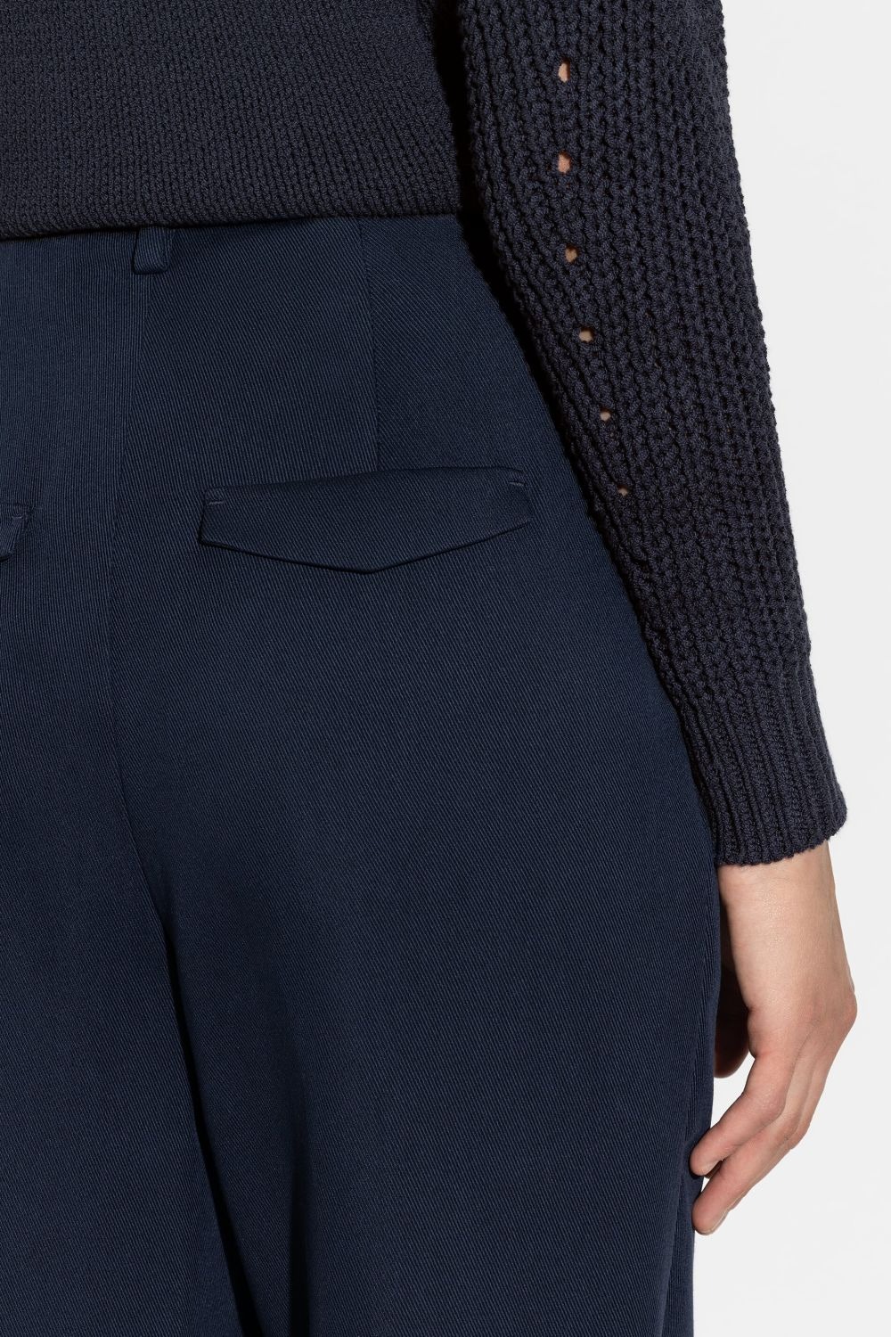 Укороченные брюки слегка зауженного силуэта из мягко струящегося габардина. Особенности включают складки, двойные петли для ремня, боковые карманы и декоративные задние карманы с клапанами.