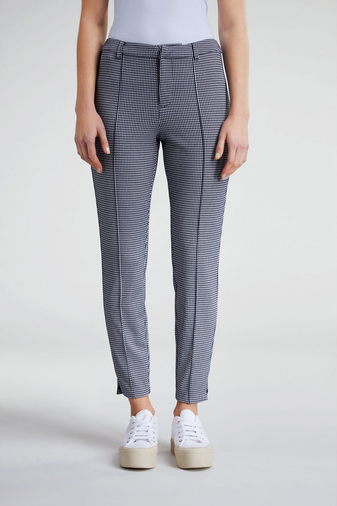 Прямые брюки средней посадки - совсем не скучная модель! Укороченная длина брюк позволяет продемонстрировать модную обувь. Стрелки делают образ более строгим. Классический клетчатый орнамент "гусиная лапка" является одним из современных трендов. В сочетании с лаконичным верхом эти брюки станут модным акцентом в вашем образе.