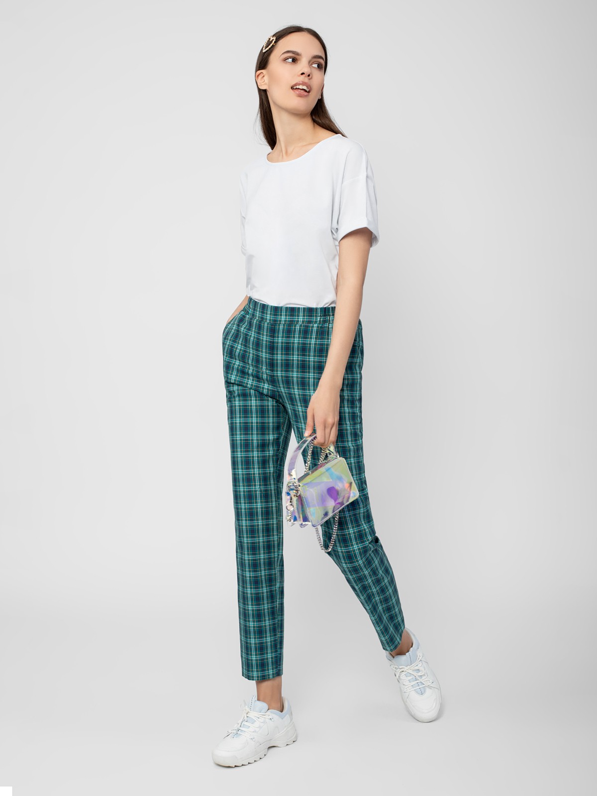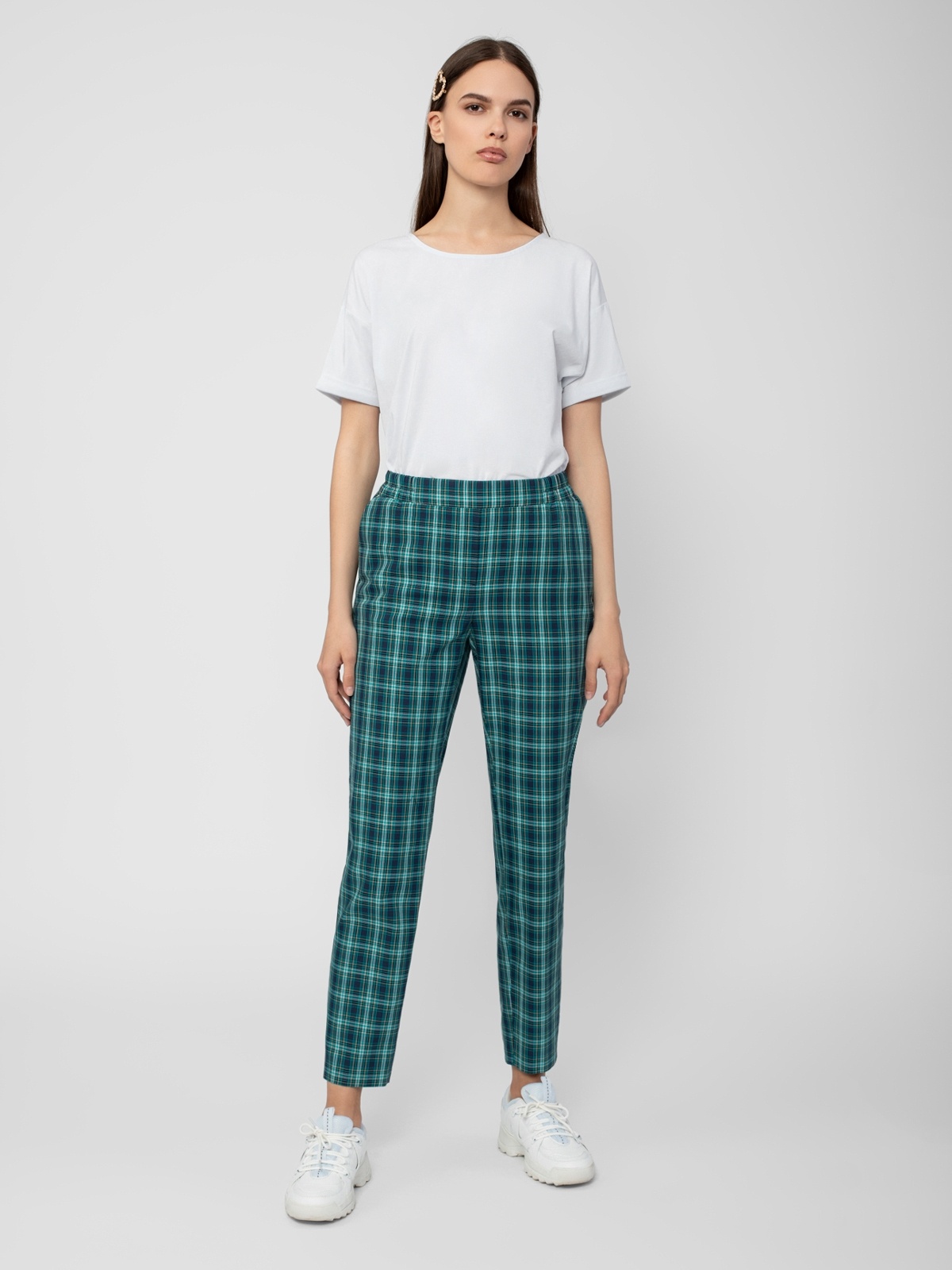 Брюки из костюмной ткани в клетку прямого силуэта зауженного к низу на притачном поясе с боковыми карманами.