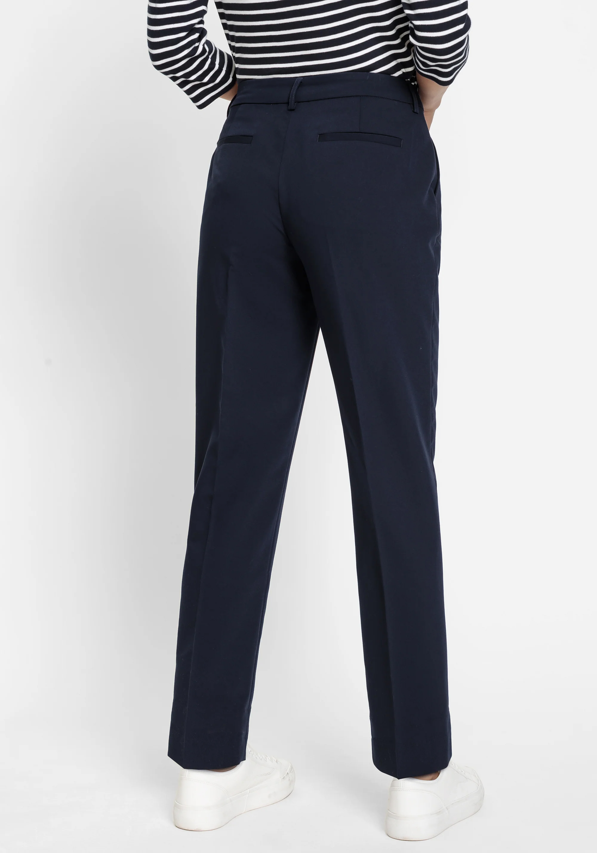 Офисные брюки укороченной длины из качественной ткани с гладкой поверхностью. Разработаны с боковыми прорезными карманами, задними прорезными карманами и шлевками для ремня. Короткие разрезы на подоле, заутюженная складка по центру передней части штанины и немного эластана для дополнительной эластичности добавляют стильные детали этого универсального базового элемента гардероба. Эти брюки идеально сочетаются с соответствующим блейзером для создания скоординированного ансамбля. Крой свободный в области бедер и ягодиц, модель сидит немного ниже естественной линии талии для комфортной носки.