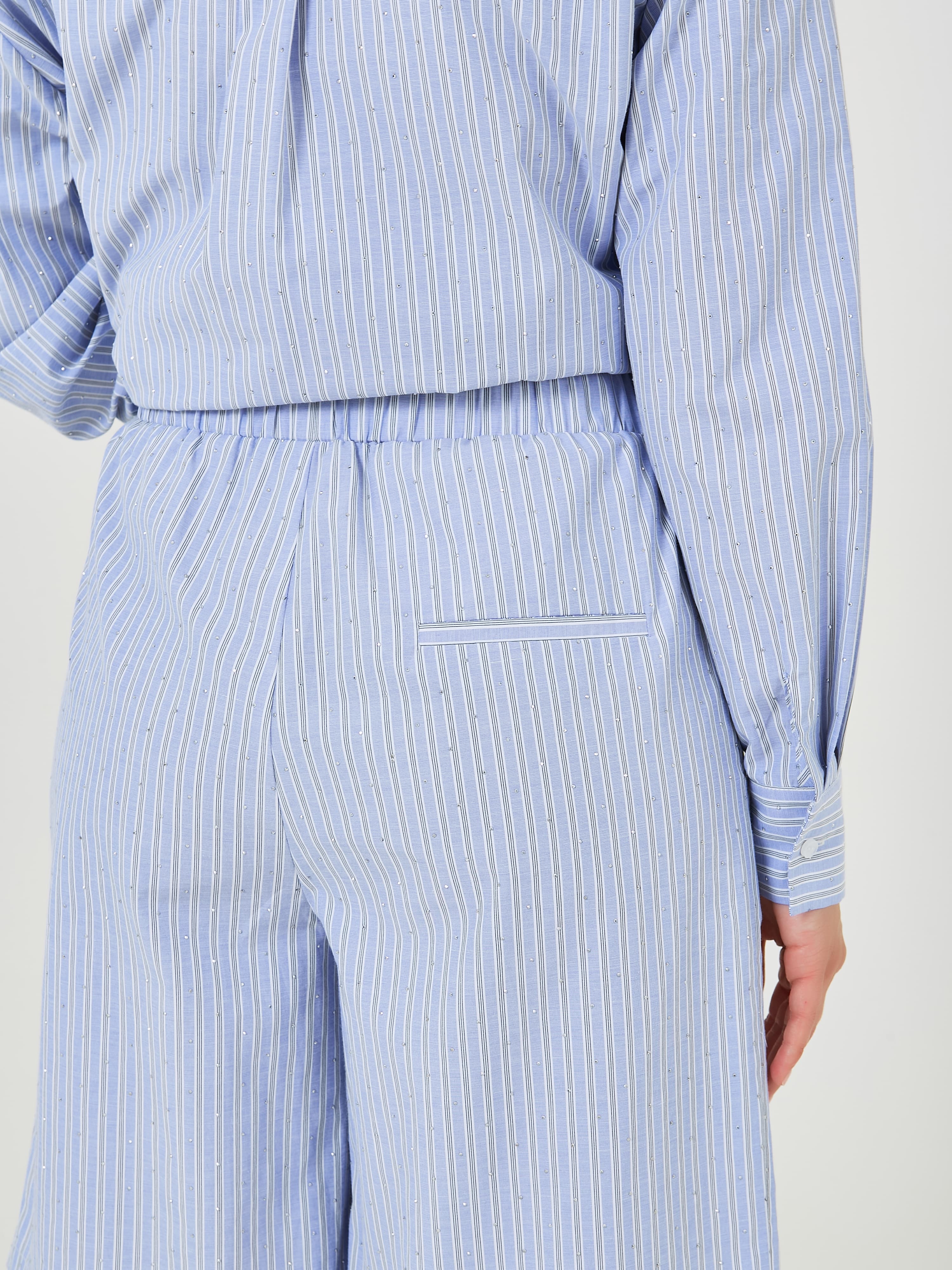 Шорты с эластичным поясом и завязками выполнены в светло-голубом цвете с тонкими вертикальными полосками и стразами, что придаёт им свежий и стильный вид. Коллекция Весна-Лето 2025. Капсула "Санторини". Параметры модели: 89-70-92, рост 167, размер 44-46