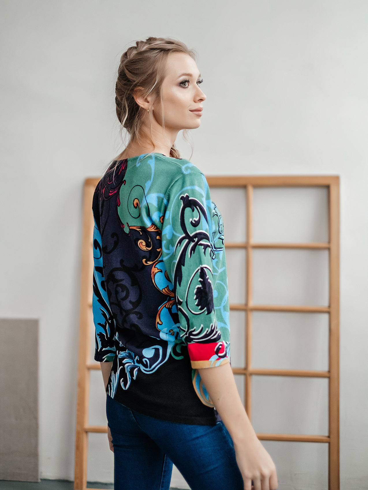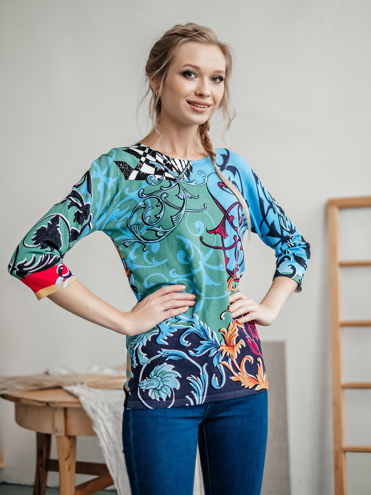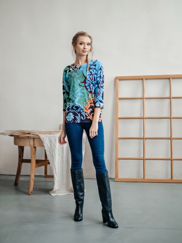 На сайте указаны Российские размеры. Теплый джемпер обращает на себя внимание благодаря контрастному принту. Прямой покрой, круглый вырез горловины, втачные рукава 3/4. Завершает яркий дизайн декор из пайеток. Приятный к телу материал из смеси вискозы и хлопка обеспечивает комфорт.