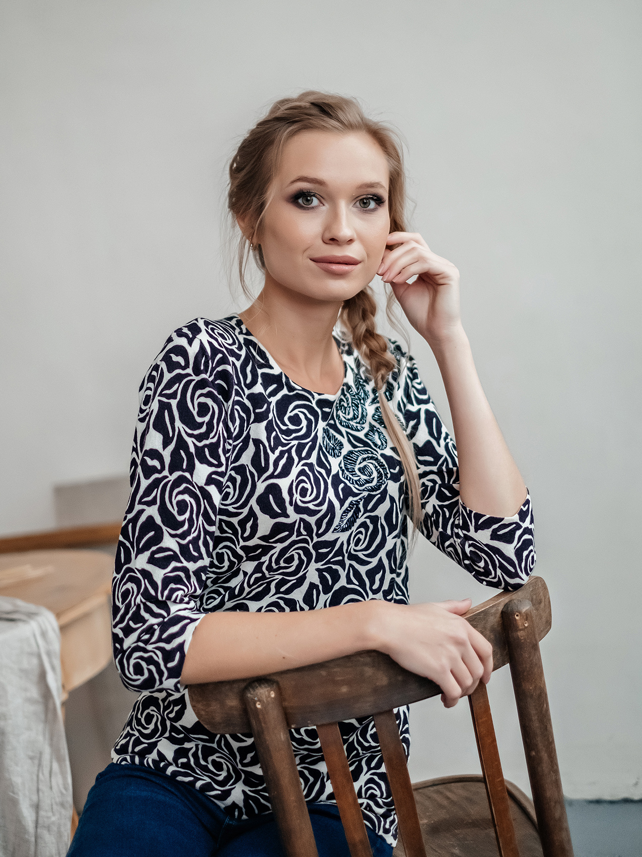 Классическое сочетание черного и белого может быть нежным и женственным! Это достигается за счет цветочного орнамента джемпера. Слегка приталенный силуэт, круглый вырез горловины, втачные рукава 3/4. Декор бисером придает джемперу изысканность. Материал из смеси с вискозой и хлопком приятен к телу и обеспечивает комфорт.