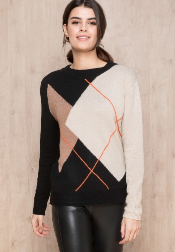 Джемпер свободного покроя великолепно дополнит ваш осенний образ. Круглый вырез горловины, рукава полной длины со спущенным плечом. Новая интерпретация узора с ромбами притягивает восхищенные взгляды. Смесовый материал с вискозой и шерстью в составе приятен к телу и обеспечивает сохранение тепла.