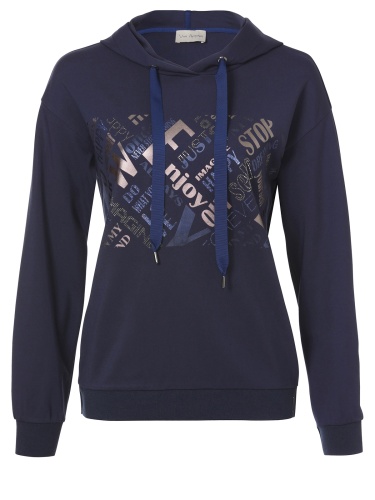 Однотонная толстовка насыщенного синего оттенка с оригинальным принтом на груди. Прямой силуэт, эластичная резинка по низу изделия. Капюшон на кулиске с широким шнурком в тон изделия. Спущенная линия плеч, длинные втачные рукава.