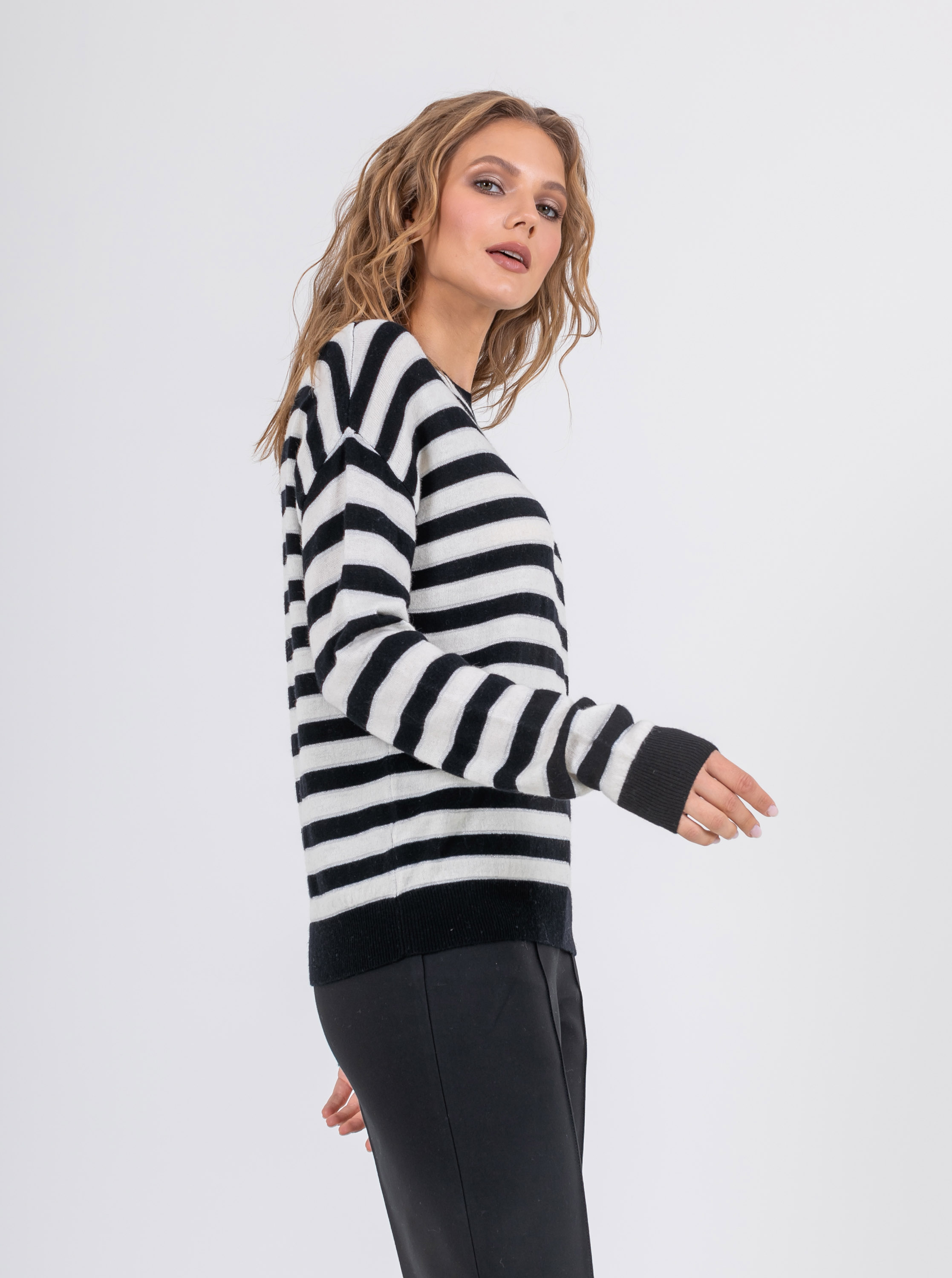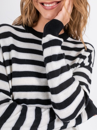 На сайте указаны российские размеры. Ткань: выполнен из 100% шерсти, которая прекрасно сохраняет тепло, пропускает воздух и впитывает влагу. Крой: классическая удлиненная модель свободного силуэта с длинными рукавами и круглым горлом. Слегка опущенная зона рукава обеспечивает максимальный комфорт и свободу при движении. Универсальная модель, подходящая женщинам с разным типом фигур. Отделка: отделка резинкой на манжетах и низе джемпера обеспечивает плотное прилегание, изделие не поднимается вверх и не открывает зону живота. Джемпер из мягкой шерсти в классическую черно-белую полоску создает французский шик. Прекрасно сочетается с джинсами, классическими и зауженными брюками, юбками А-силуэта и юбками-карандаш, шортами и кюлотами.
