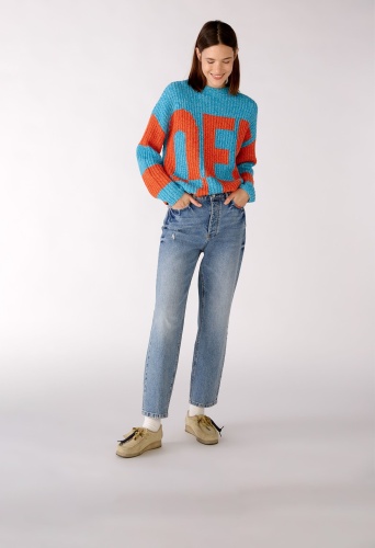 На сайте указаны российские размеры. Хлопковая смесь грубой вязки. Эффект цветных блоков в сочетании с пряжей мини-букле в стиле мулине. Покрой оверсайз со спущенными плечами. Неброские рукава и концы кромки.