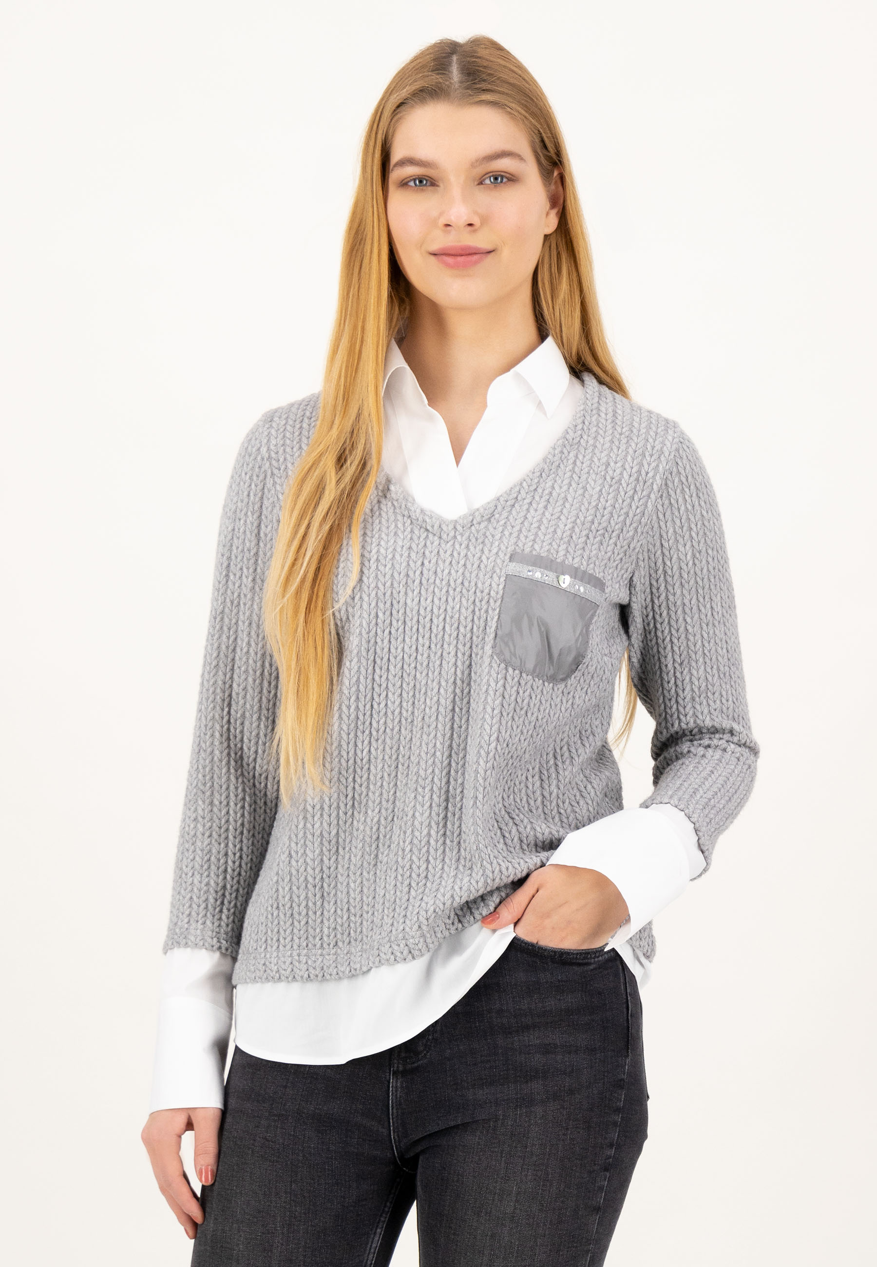 На сайте указаны российские размеры. Этот пуловер «два в одном» умело устраняет грань между повседневностью и шиком — благодаря блузочной вставке с рубашечным воротником в пуловере вы можете легко создать прекрасный образ. Благодаря удлиненной задней части свитер 2 в 1 создает красивый силуэт. Внешний вид грубой вязки привлекает внимание в сочетании с прикрепленным карманом из мерцающего контрастного материала. Блестящие детали прекрасно завершают детализированный стиль уникального свитера! Рост модели 177 см Измерения для 44 размера: Окружность груди: 104 см Талия: 101 см Ширина бедер: 110 см Длина спинки: 70 см Длина рукава: 62 см