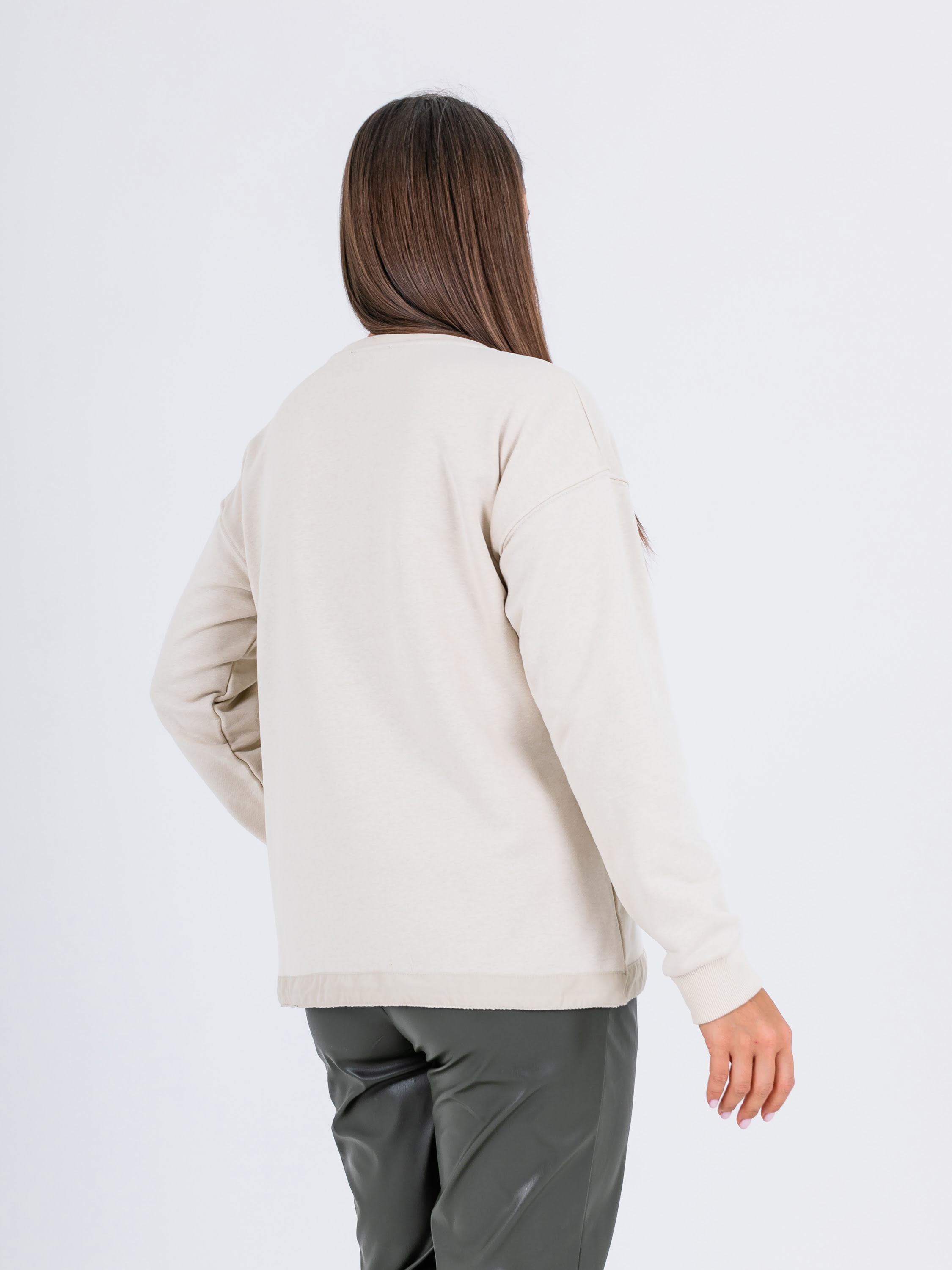 Свитшот прямого силуэта средней длины из легкого 100% хлопка. По переду выполнена эффектная вышивка пайетками. Низ обработан кулиской с резинкой и металлическим фиксатором, для регулировки объема. Длинные втачные рукава с манжетами. Круглый вырез горловины.