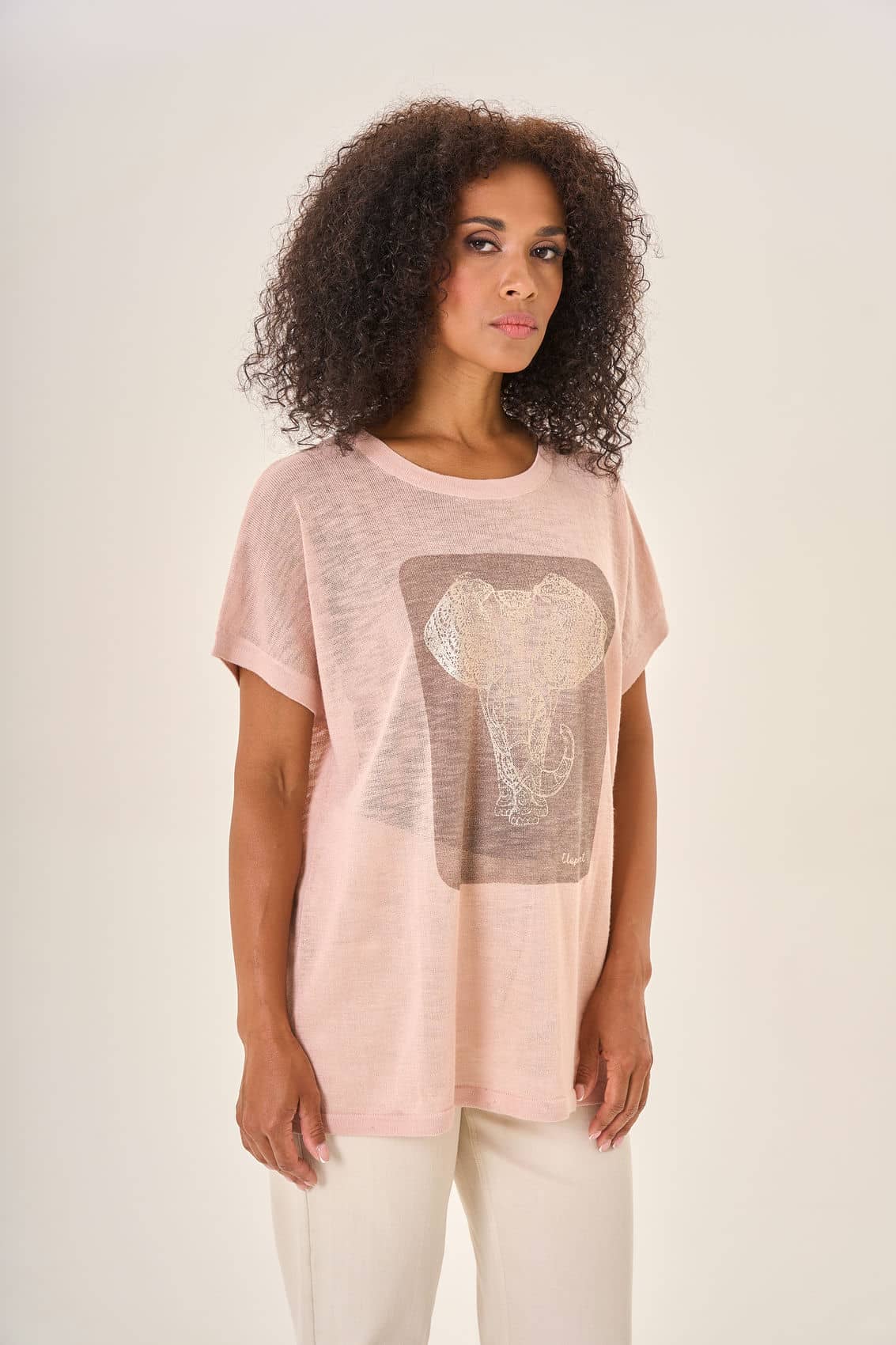 Свободная блузка пастельно-розового оттенка с коротким рукавом и круглым вырезом. Центральное внимание привлекает крупный прямоугольный принт на передней стороне — изящный рисунок слона, выполненный в стилистике классической гравюры. Изящный дизайн и приятный к телу материал делают эту блузку идеальным выбором для создания легкого и романтичного образа.