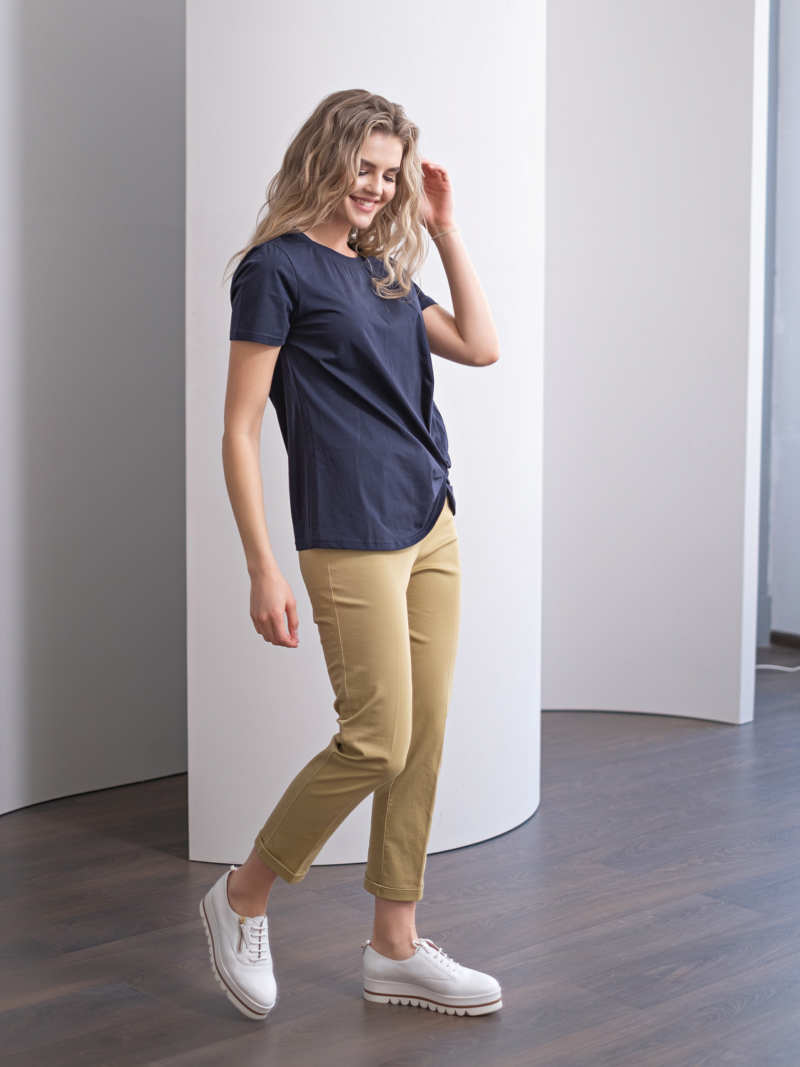 Ткань из натуральных материалов обеспечит комфорт и прохладу жарким летом. Круглый вырез горловины, декоративный элемент в виде фигурного узла и закругленный низ футболки создадут женственный образ. Данная модель будет хорошо сочетаться с брюками и с юбкой-карандашом.