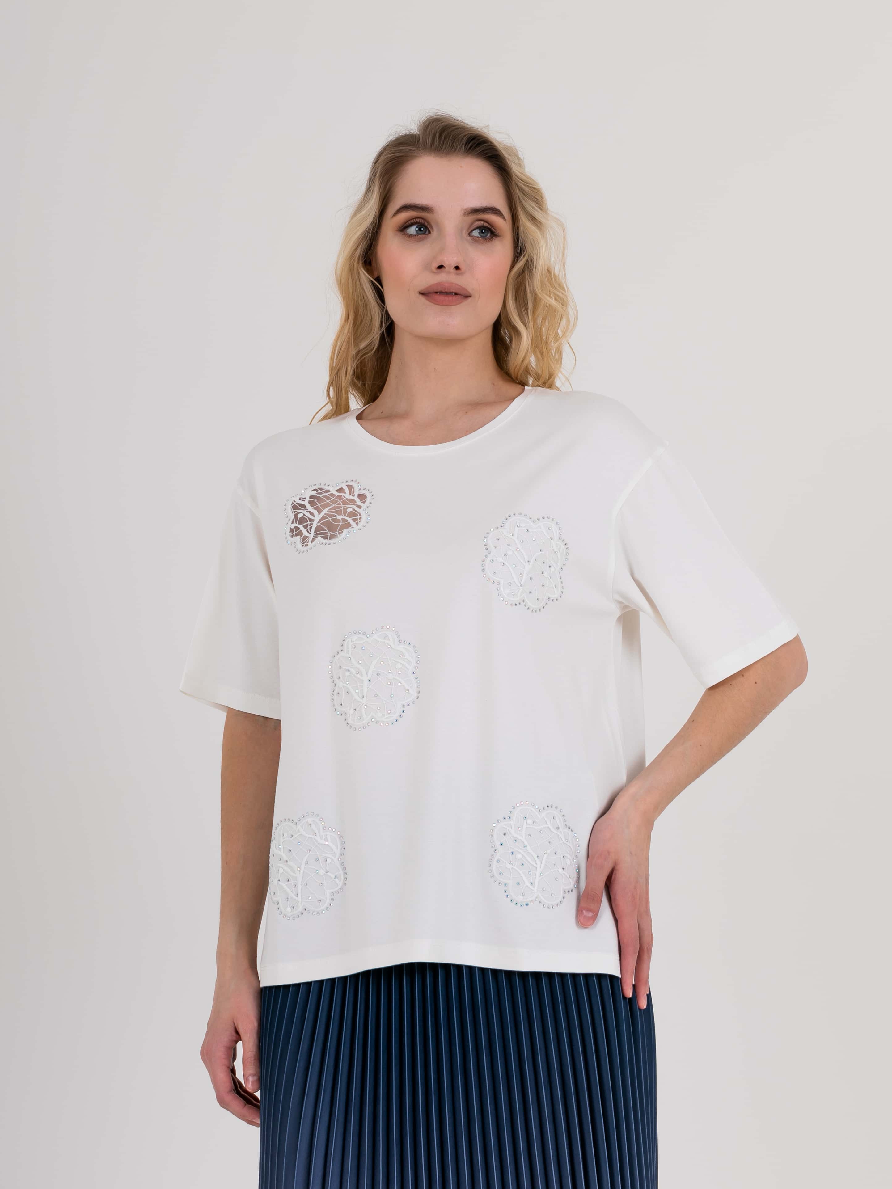 Длинная оверсайз футболка прямого силуэта из легкой, мягкой вискозы с добавлением эластана. По переду выполнена нежная вышивка на сетке, украшенная стразами. Укороченные втачные рукава со спущенной линией плеча. Круглый вырез горловины.