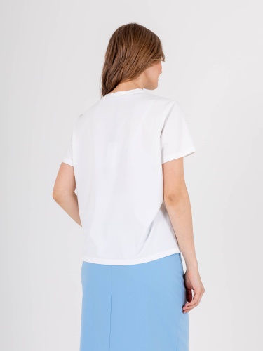 Футболка средней длины прямого силуэта из легкого хлопка с добавлением спандекса. По переду выполнен нежный растительный принт с вышивкой. Укороченные втачные рукава. Круглый вырез горловины.