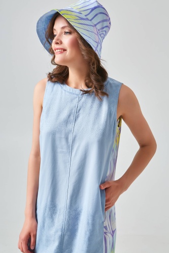 Платье без рукавов в сочетании высококачественной ткани Tencel спереди и набивной струящейся атласной ткани сзади позволяет платью комфортно сидеть на теле. Круглый вырез горловины украшен бахромой. Разрез и застежка на пуговице посередине спины.