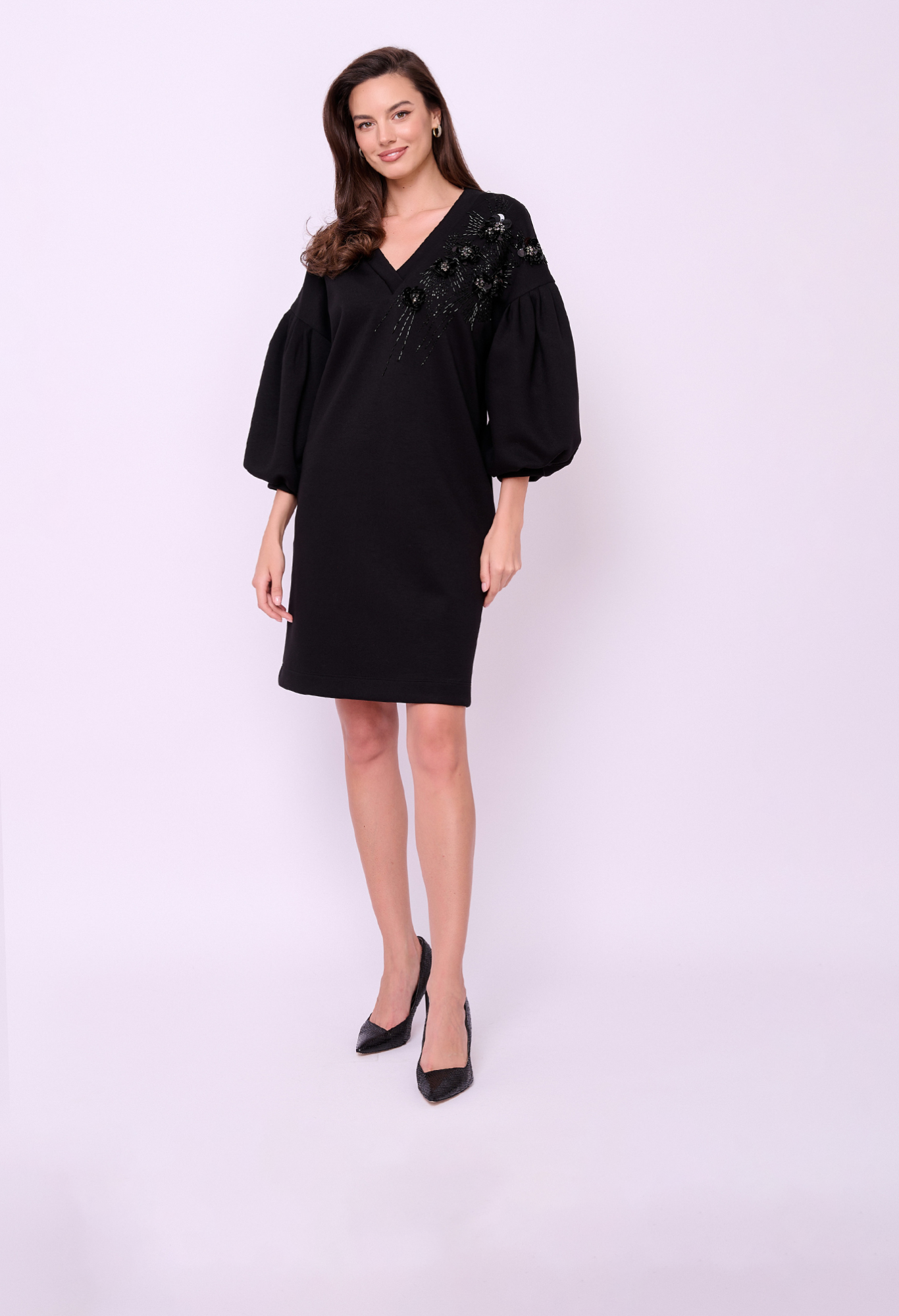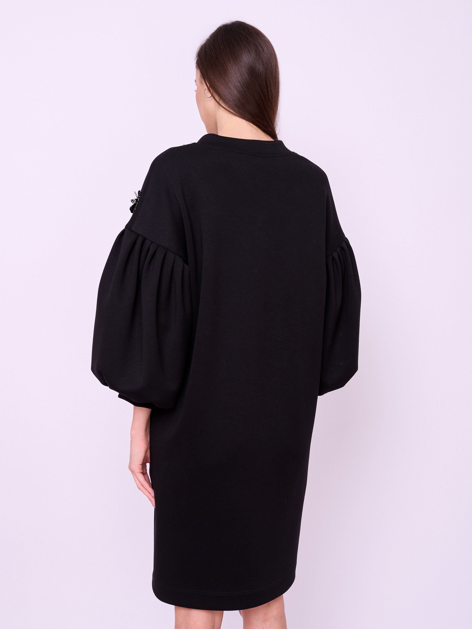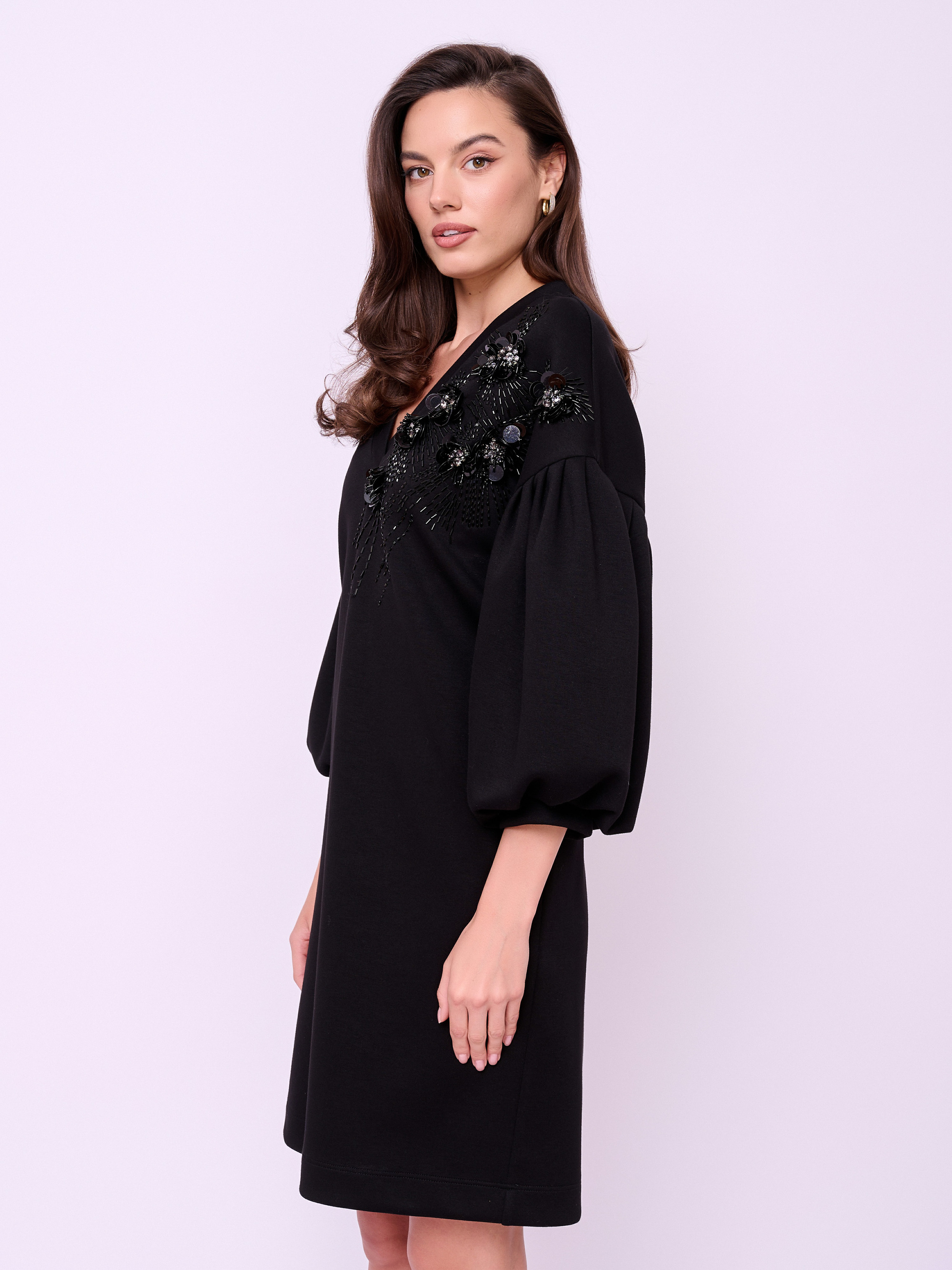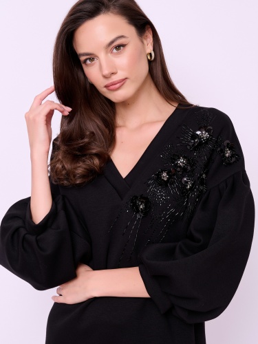 Платье средней длины без застежки, с V-образным вырезом горловины, объемными рукавами 7/8, карманами в боковых швах и вышивкой из бисера, пайеток и кристаллов. Длина по спинке: 91 см.