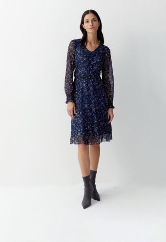 Струящееся сетчатое платье с современным цветочным принтом и резинкой на талии можно носить как с кардиганом, коротким пиджаком. Женственный V-образный вырез, длинные прозрачные рукава с присборенными манжетами. Эластичная талия, непрозрачная подкладка. Длина по размеру 44 - 104 см.