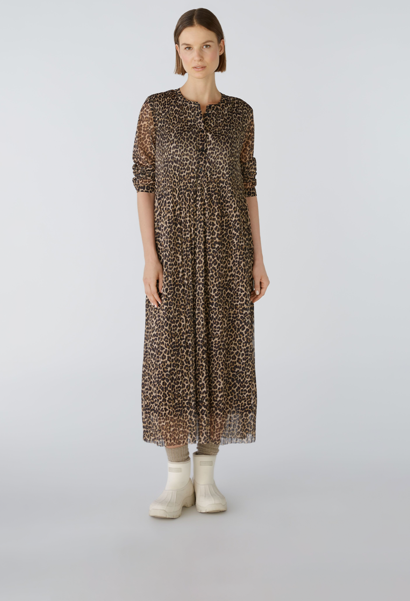 Струящееся платье из сетки со складками и принтом по всей поверхности. Свободный крой, длина миди. Круглая горловина с длинной планкой на пуговицах, легко надевается. Рукава длиной 3/4 с манжетами и маленькой пуговицей. Плотно прилегающие складки на верхней части тела, свободные и струящиеся в области юбки. Длина для размера 42: 126 см.