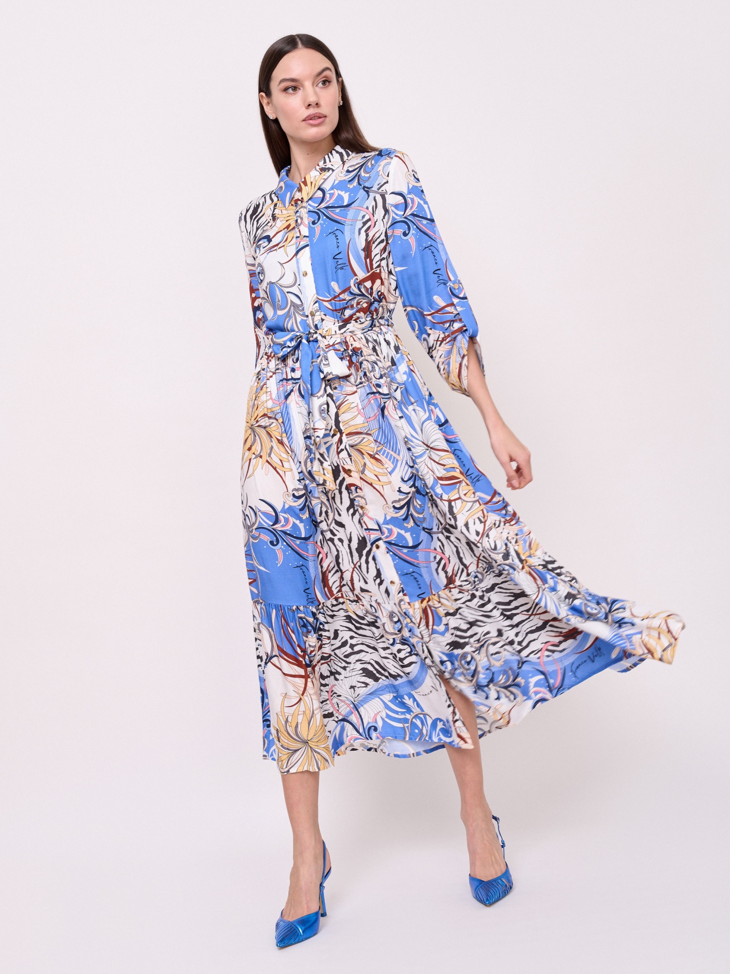Визкозная ткань, застежка пуговицы, вырез горловины отложной воротничок, рукава 7/8 с хлястиками на пуговице, покрой рубашечный, рисунок орнамент, карманы в шве, конструктивные элементы воланы, длина платья макси, пояс из основной ткани. Длина по спинке: 126 см.
