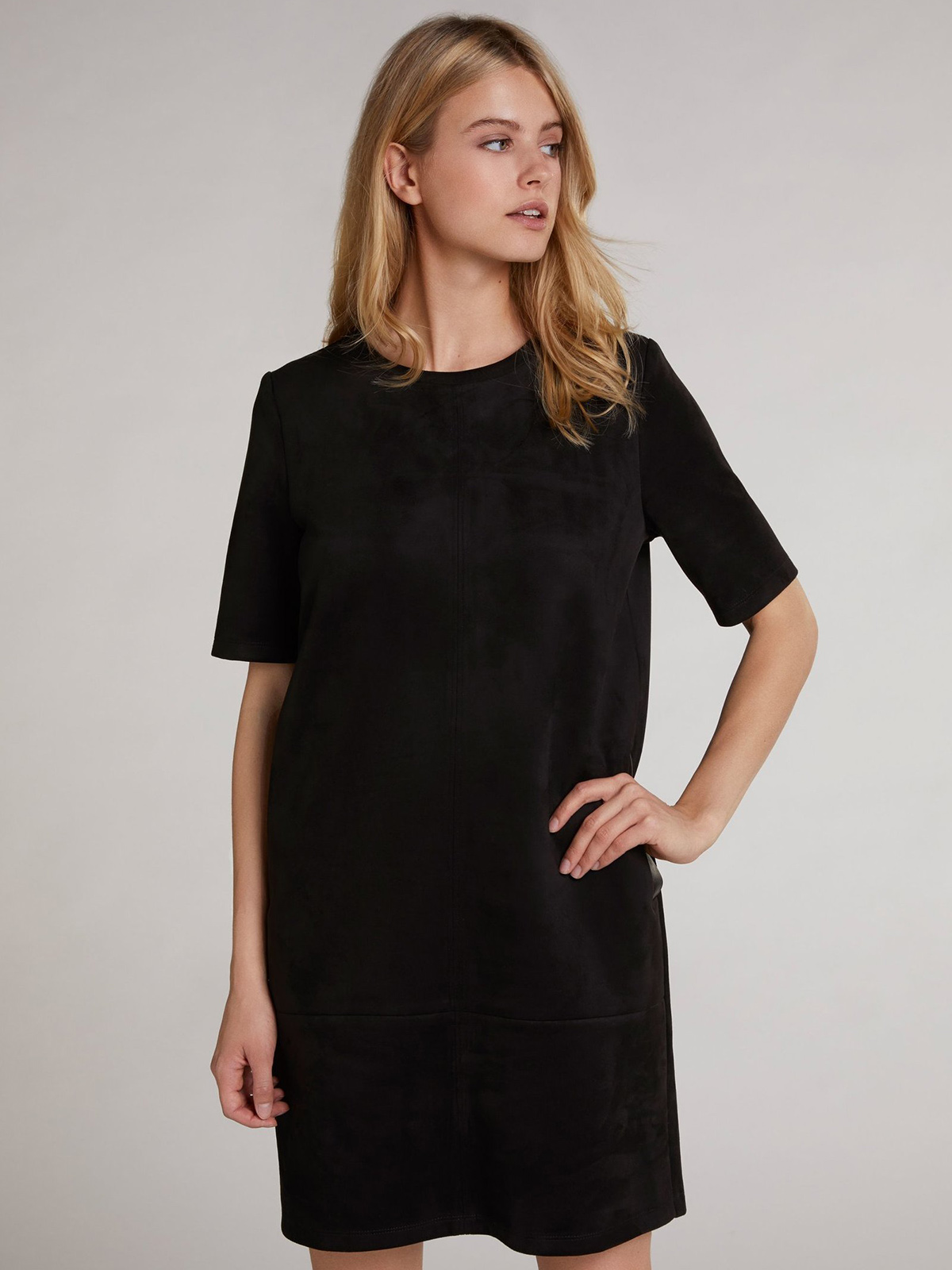 Черное мини-платье прямого кроя выполнено под замшу. Круглый вырез горловины, корткий втачной рукав. Врезные карманы с листочкой из экокожи являются стильным акцентом.