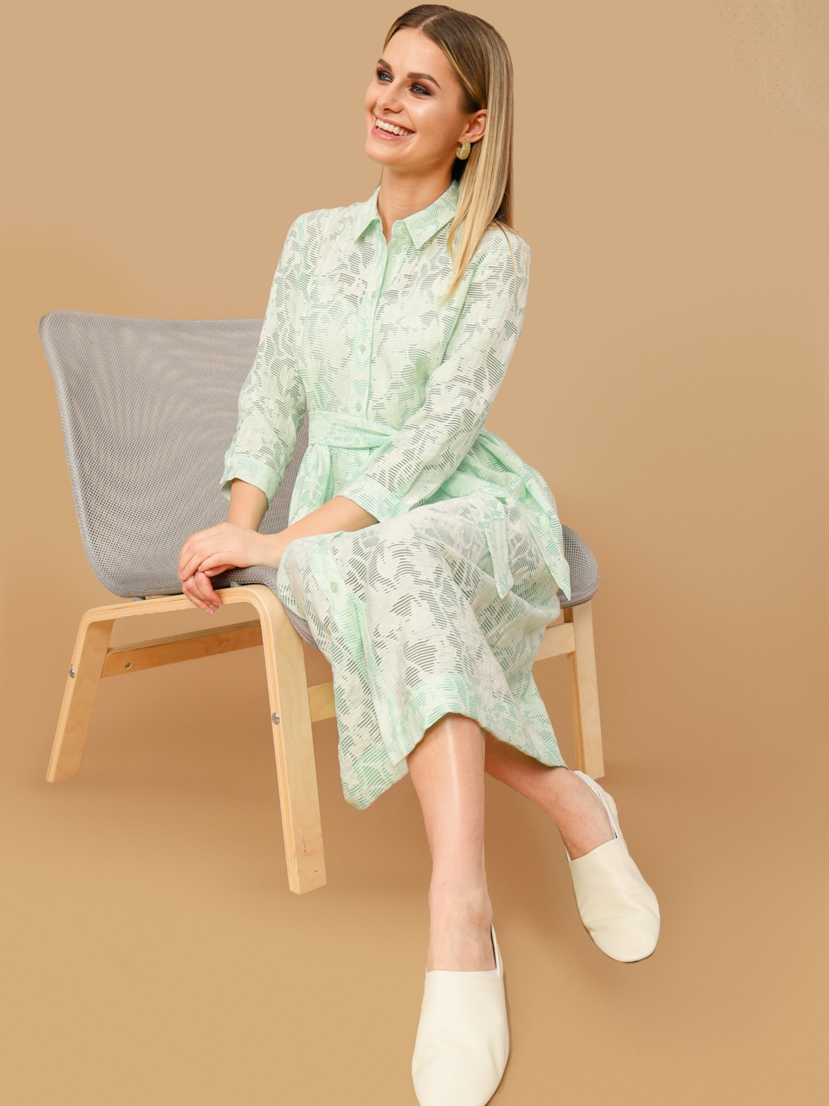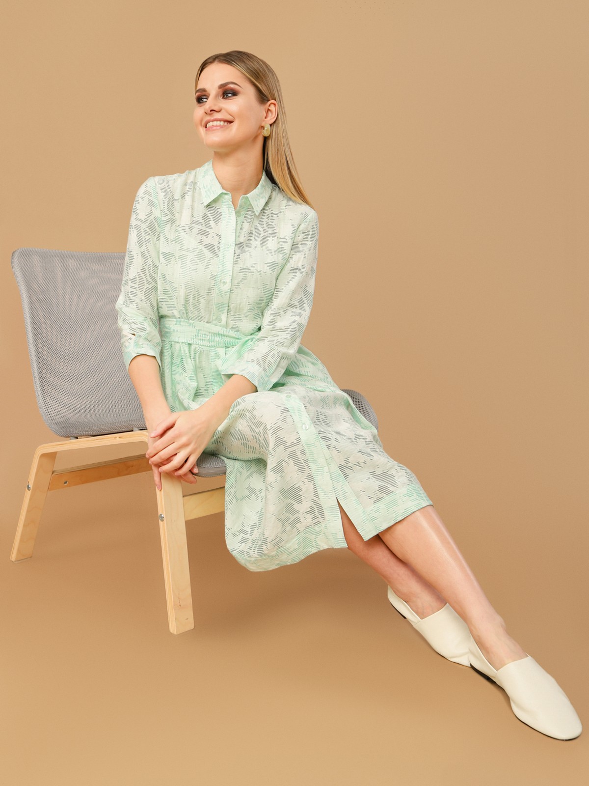 Платье-рубашка из плательной ткани с принтом. Силуэт трапеция, классический отложной воротник, втачной рукав на манжете, застежка спереди на пуговицы. На талии съемный пояс из основной ткани.