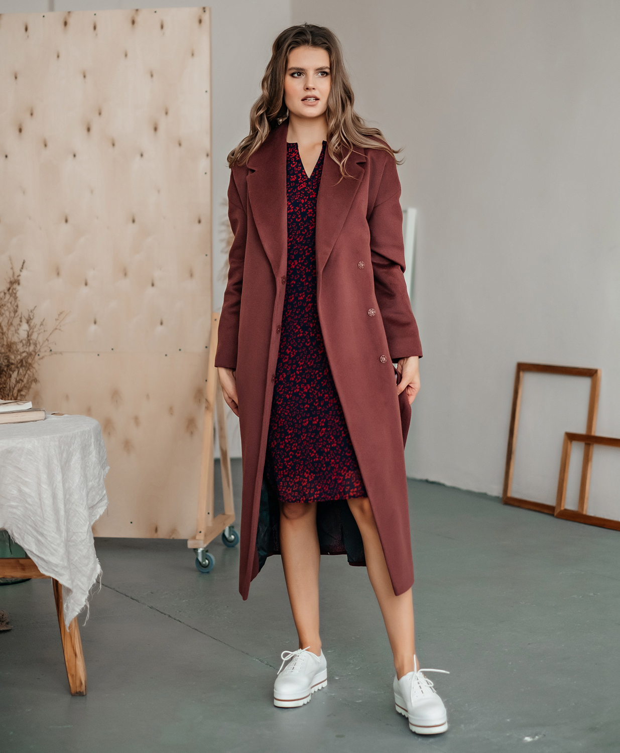 Пальто прямого силуэта длиной выше колена. Втачной рукав, застёжка на пришивные кнопки, английский воротник, горизонтальный подрез на полочке и спинке, вертикальные карманы-листочки.