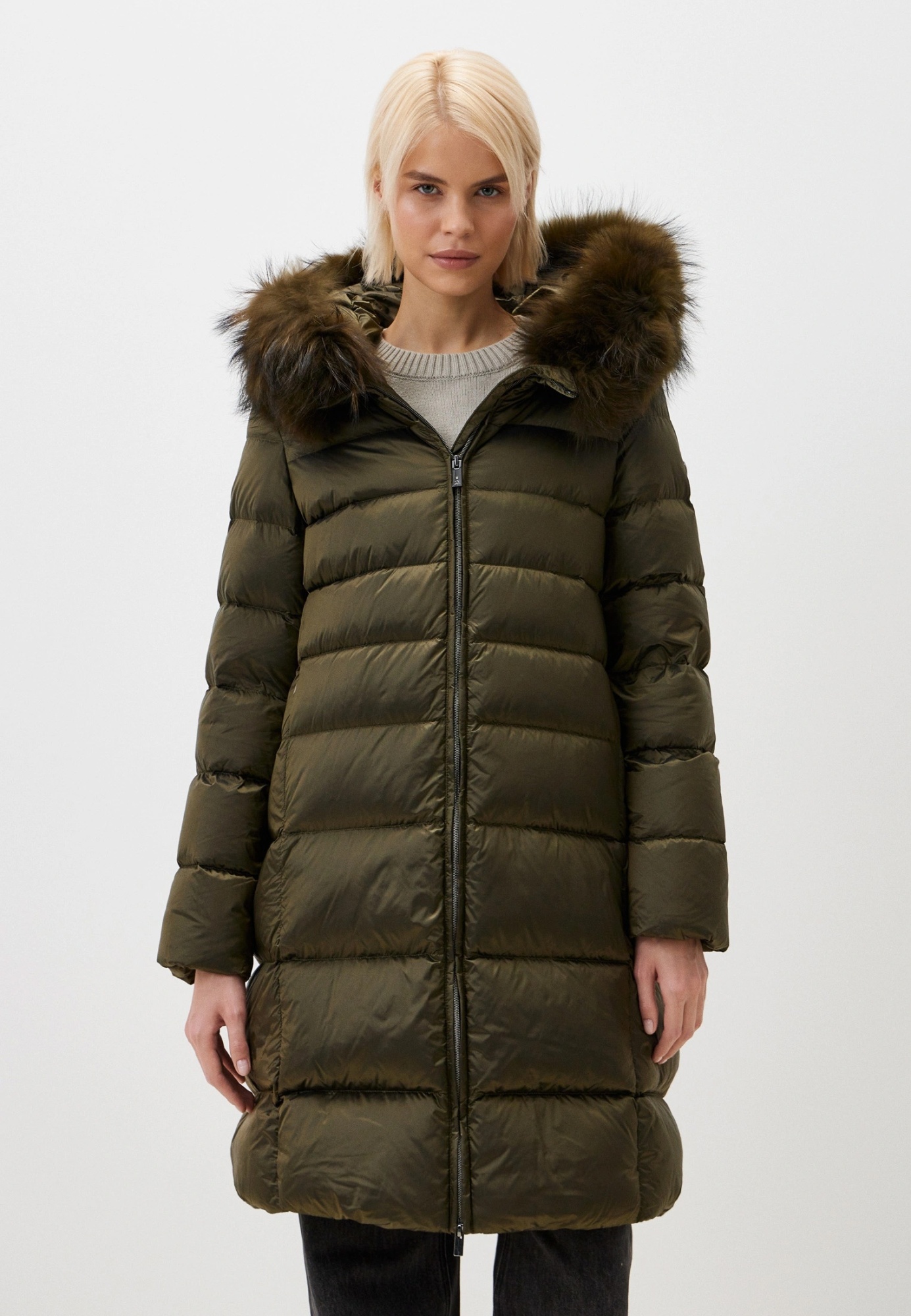 Зимний пуховик MADZERINI цвета хаки с опушкой на капюшоне.