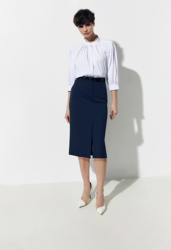 Юбка полуприлегающего силуэта на притачном поясе со шлевками. Выполнена из костюмной ткани с добавлением вискозы. Спереди у юбки имеется шлица для удобства шага. Функциональные карманы джинсовой формы и два ложных прорезных кармана сзади. Юбка составляет хорошую пару с прямым жакетом в полоску из одной капсулы.