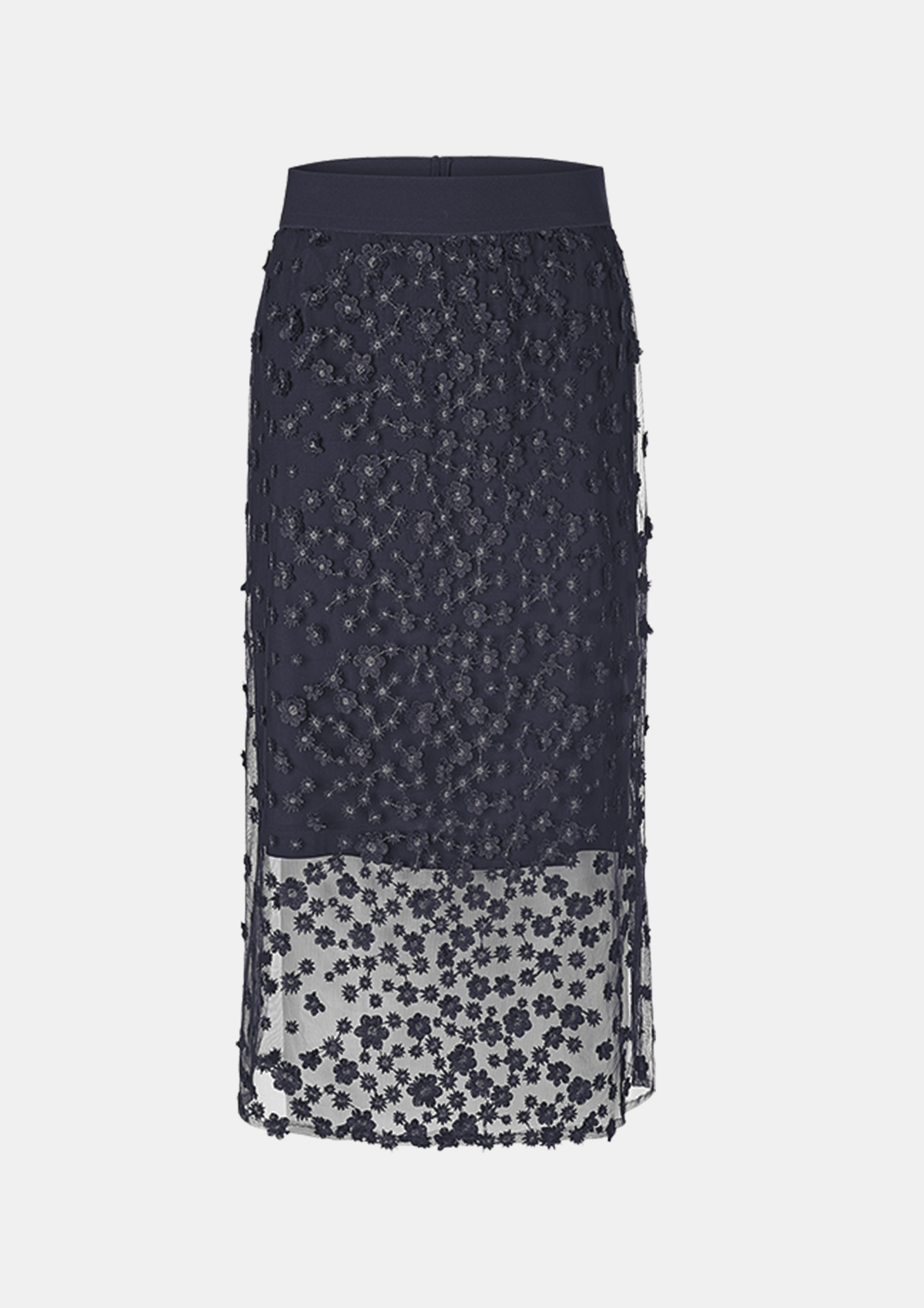 Юбка-миди с замысловатой объемной цветочной вышивкой, которая поднимет вам хорошее настроение. Юбка-комбинация прямого кроя изготовлена из тонкого черного тюля, который в сочетании с синими объемными цветами создает красивый глубокий синий цвет.