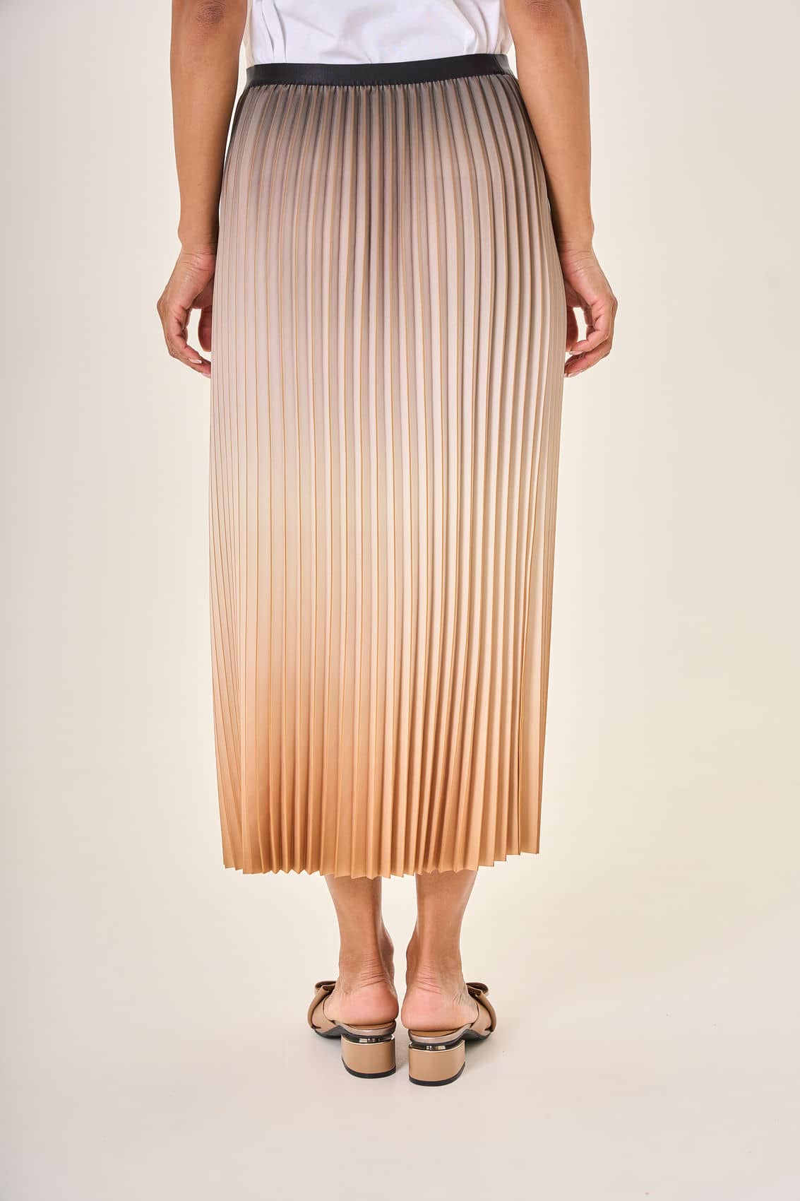 Плиссированная юбка средней длины с плавным градиентом,перетекающим от благородного серо-коричневого к роскошному золотистому оттенку. Завершающий штрих образа — контрастный чёрный пояс, подчёркивающий талию и добавляющий динамики силуэту.