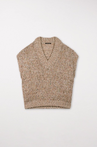 На сайте указаны российские размеры. Жилет из итальянской разноцветной твидовой пряжи с добавлением кашемира и шелка. Легкая открытая отделка идеально дополняет объемный силуэт с V-образным вырезом и заниженной линией плеч. Наша модель ростом 178 см.