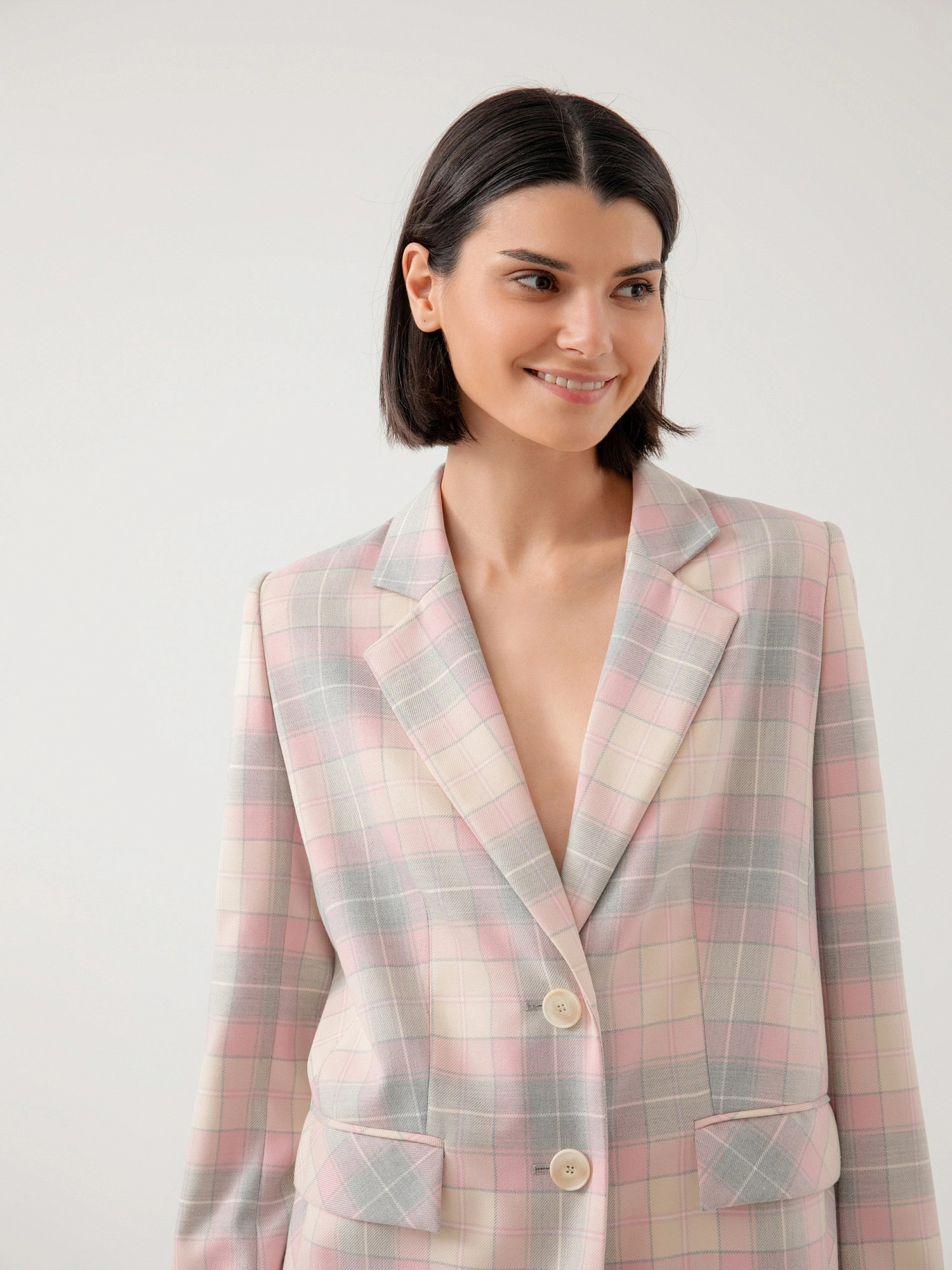 На сайте указаны российские размеры. Удлинённый прямой однобортный жакет с двумя пуговицами из костюмной ткани в серо-розовую клетку. Английский воротник с V-образным вырезом. Жакет с прорезными карманами и накладными клапанами. Жакет полностью на подкладке. Рост модели 175 см.