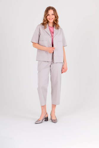Укороченный жакет прямого силуэта из легкого хлопка с добавлением эластана. По переду два накладных кармана. Застежка на три прорезных петли и пуговицы. Укороченные втачные рукава. Пиджачный воротник.