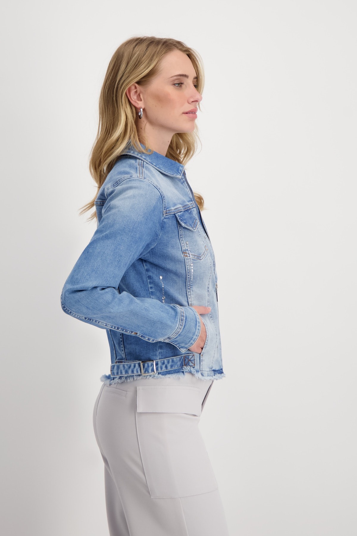 Стильная джинсовая куртка с мерцающими полосками из стразов. Закругленный подол с бахромой подчеркнут закрепкой. Регулярная посадка. Длинный рукав. Подол рукава с разрезом и манжетами. Накладные карманы с клапанами на уровне груди. Длина 44 размера 55 см.