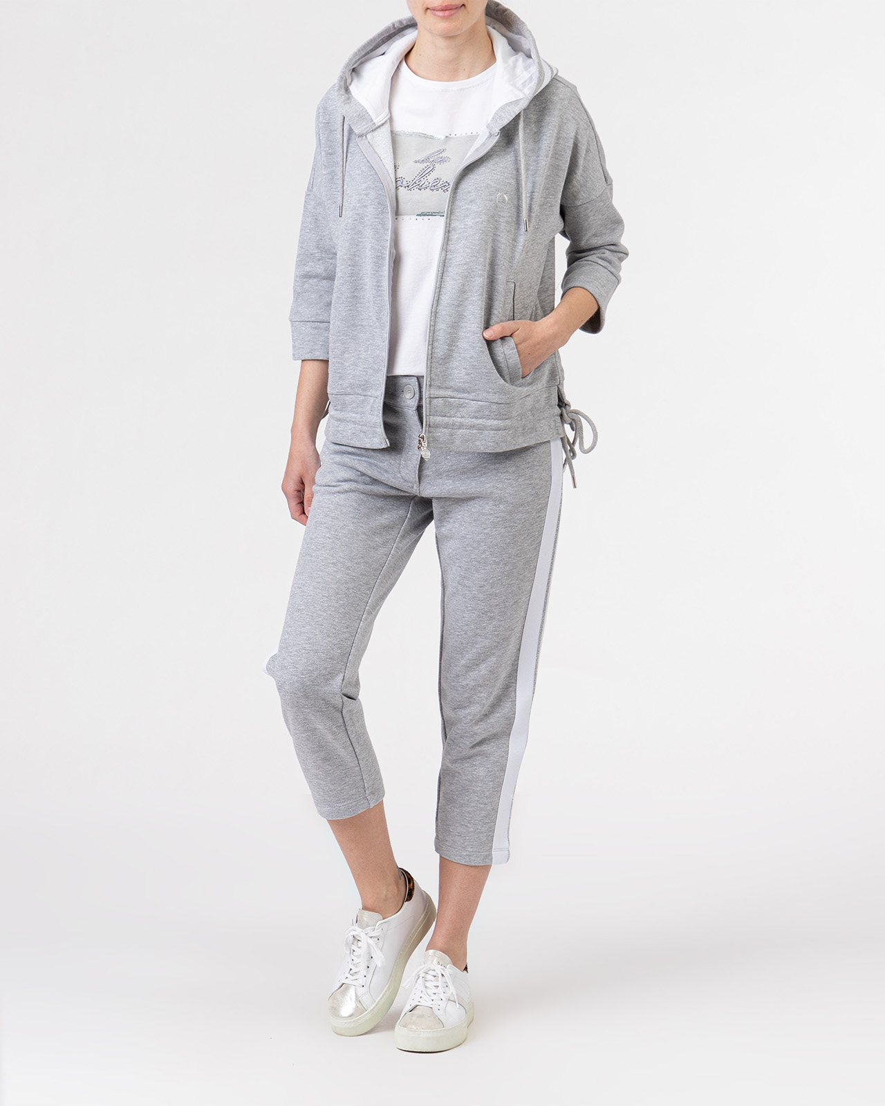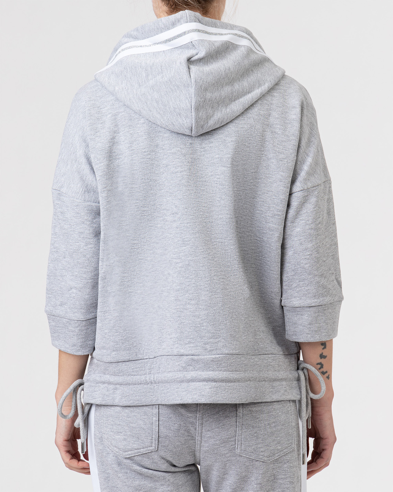 Блейзер прямого кроя с капюшоном в спортивном стиле. Застежка на молнию, втачные рукава ¾ со спущенной линией плеч. Блейзер удачно сочетать с брюками в тон из той же коллекции бренда.